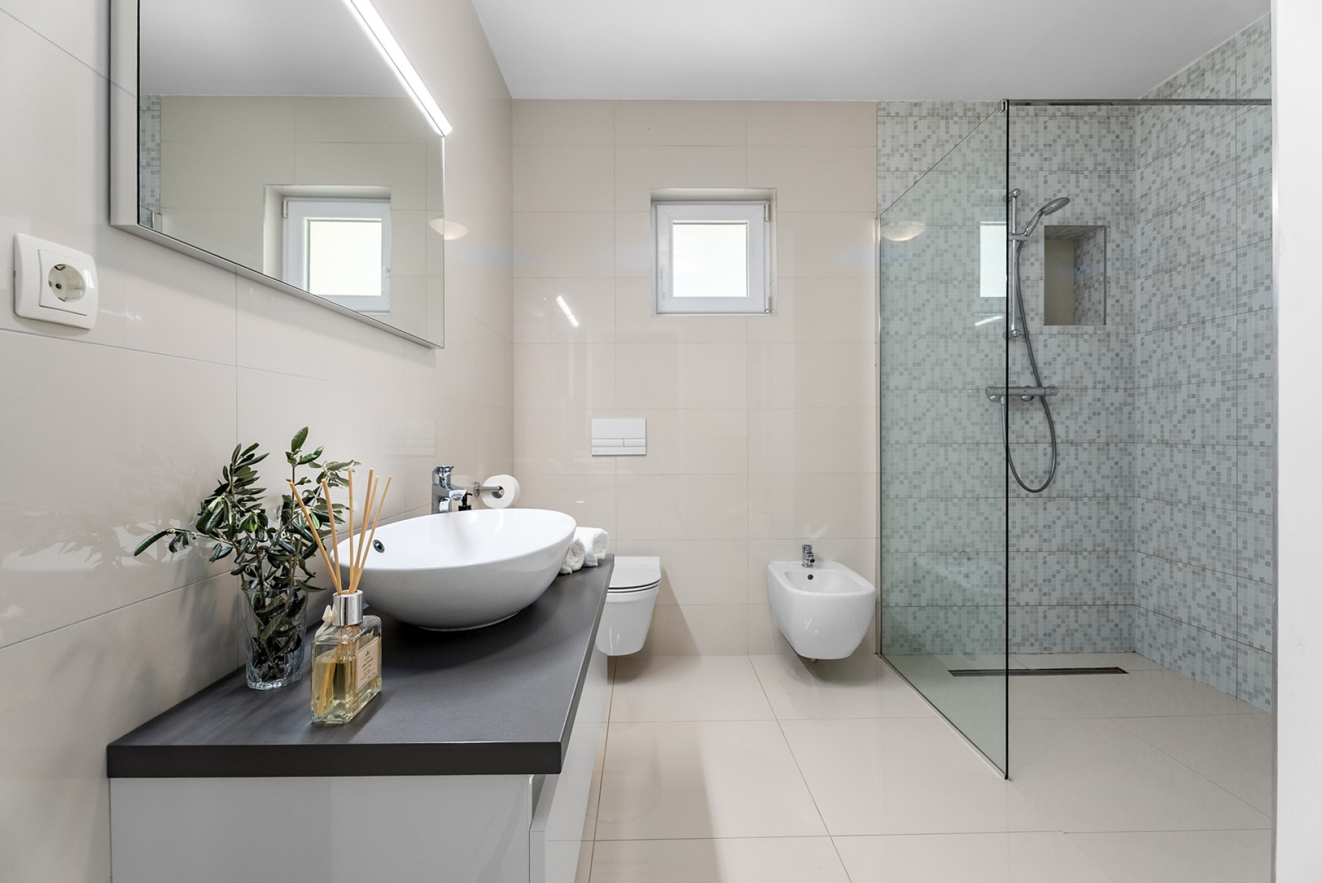 The bathrooms include two in total plus two separate toilets: 1 en-suite bathroom with a shower in bedroom no1, a spacious family bathroom with double sinks, a shower, a toilet, and a bidet; and additionally with two separate toilets for convenience.