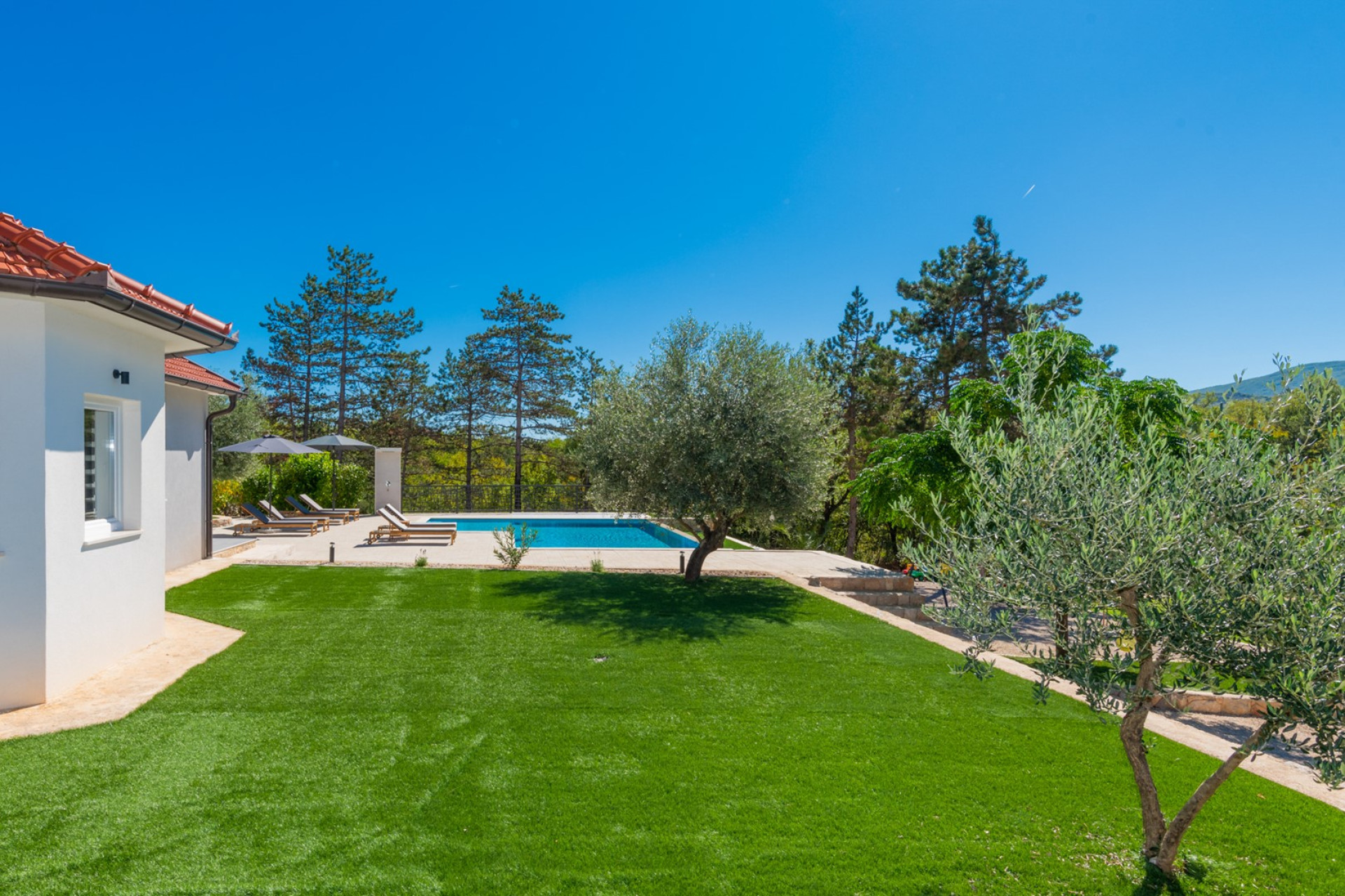 The outdoor area is a true oasis, highlighted by a spectacular 58 sqm infinity pool. The pool includes a shallow section measuring 5m by 3m with a depth of 0.5m, making it safe for your youngest family members to enjoy. The main section of the pool extends 9.5m long and 4.5m wide, with a depth of 1.5m, providing ample space for everyone to relax and have fun. Surrounding the pool is a sun deck area furnished with six comfortable loungers, sun umbrellas, and an outdoor shower, creating a perfect setting for relaxation.