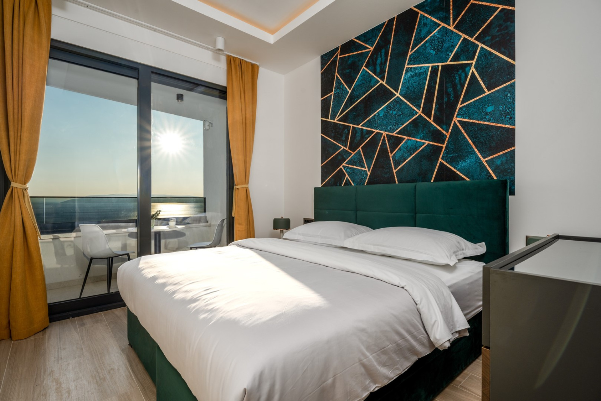 * The First floor is approached by an internal staircase, and there are three bedrooms, each with an en-suite bathroom/toilet and shower, and each air-conditioned. From the comfortable king-size (180cm x 200cm) box spring beds that the rooms are equipped with, already in the morning when you raise the blinds on the windows, you will see beautiful scenes from the Makarska coast and amazing sea views. Every bathroom has a window so that you can have contact with nature even while you are showering. Each bedroom has a balcony, or a loggia, the eastern and western rooms have two loggias, or terraces, which allows you to choose a place to rest at different times of the day. All guests have access to a large terrace upstairs with an outdoor lounge corner with spectacular views over Makarska and the islands. Terraces and loggias also help to maintain a comfortable temperature inside the villa on the hottest summer days, of course with the help of a central air conditioning system.