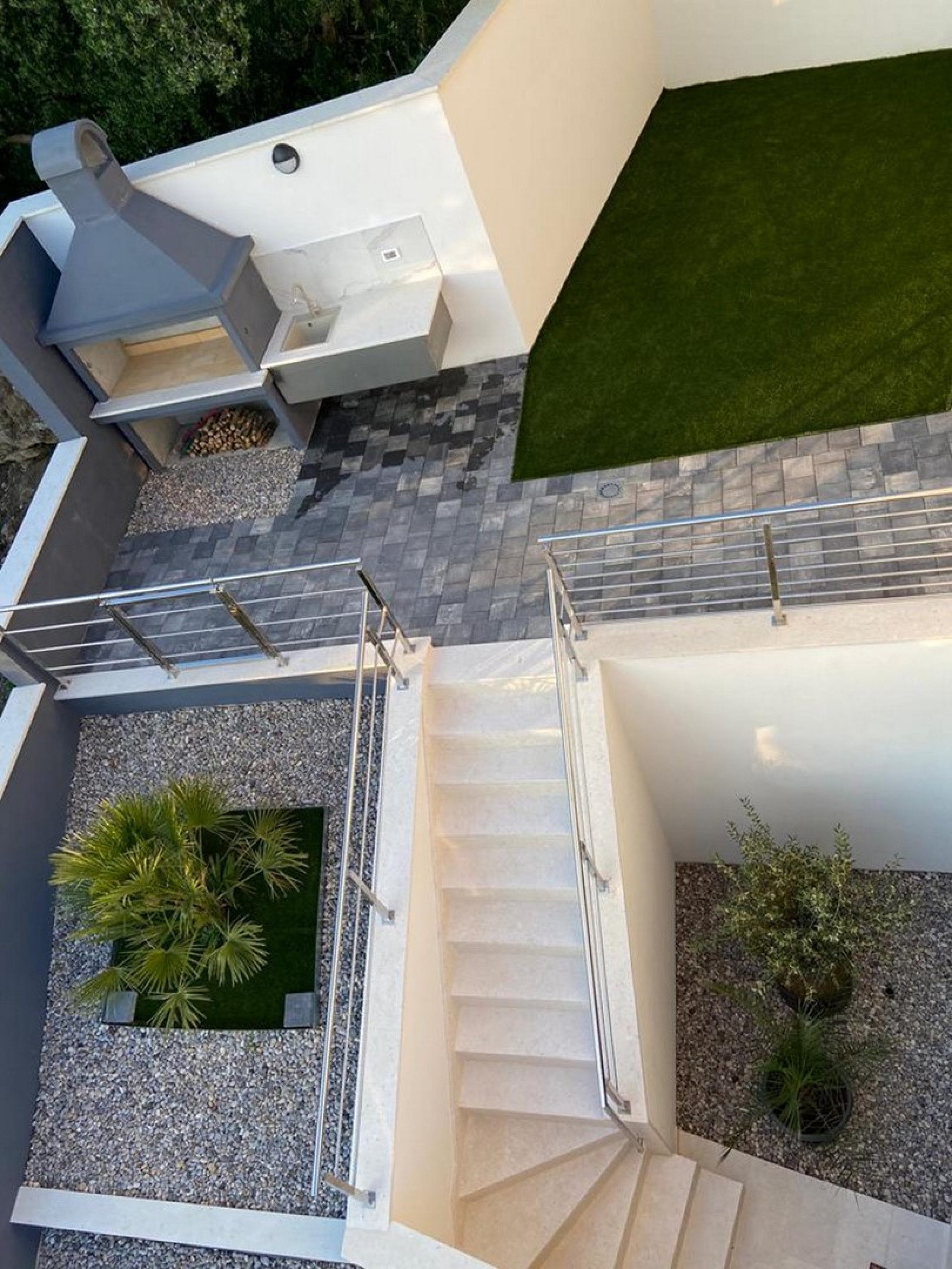 * The OUTDOOR offers a covered terrace equipped for an all-day stay, socializing, and consumption of food and drinks. Then a large swimming pool of 40 m2, a spacious sunbathing area with sunbeds, and a large garden with a barbecue, surrounded by beautiful nature. The pool is about 11 meters long and is equipped with a system for heating and cooling the water to the desired temperature. Next to the pool is a terrace with 4 deck chairs and an outdoor solar shower, and in a separate sundeck area, there are an additional 4 deck chairs. In the sunbathing area, the lounge furniture is particularly attractive for socializing at dusk, and at the edge of the pool, there is a bar with three bar stools, also accessible from the inside of the pool. The villa is surrounded by a beautifully landscaped and spacious environment with olive and pine trees. In the western part, there is a wood-burning garden grill and an adequately equipped auxiliary area so that you can enjoy preparing food from the grill for your family and friends. Next to it is a corner for your youngest with the slide and some toys on the artificial grass plot. The outdoor staircase takes you down to the airconditioned Basement area equipped with a TV, Table soccer, Rowing Machine, Exercise bike, Weights, and a Pilates ball, there is also a separate toilet, and a laundry room with a washing machine, a dryer, and ironing amenities.