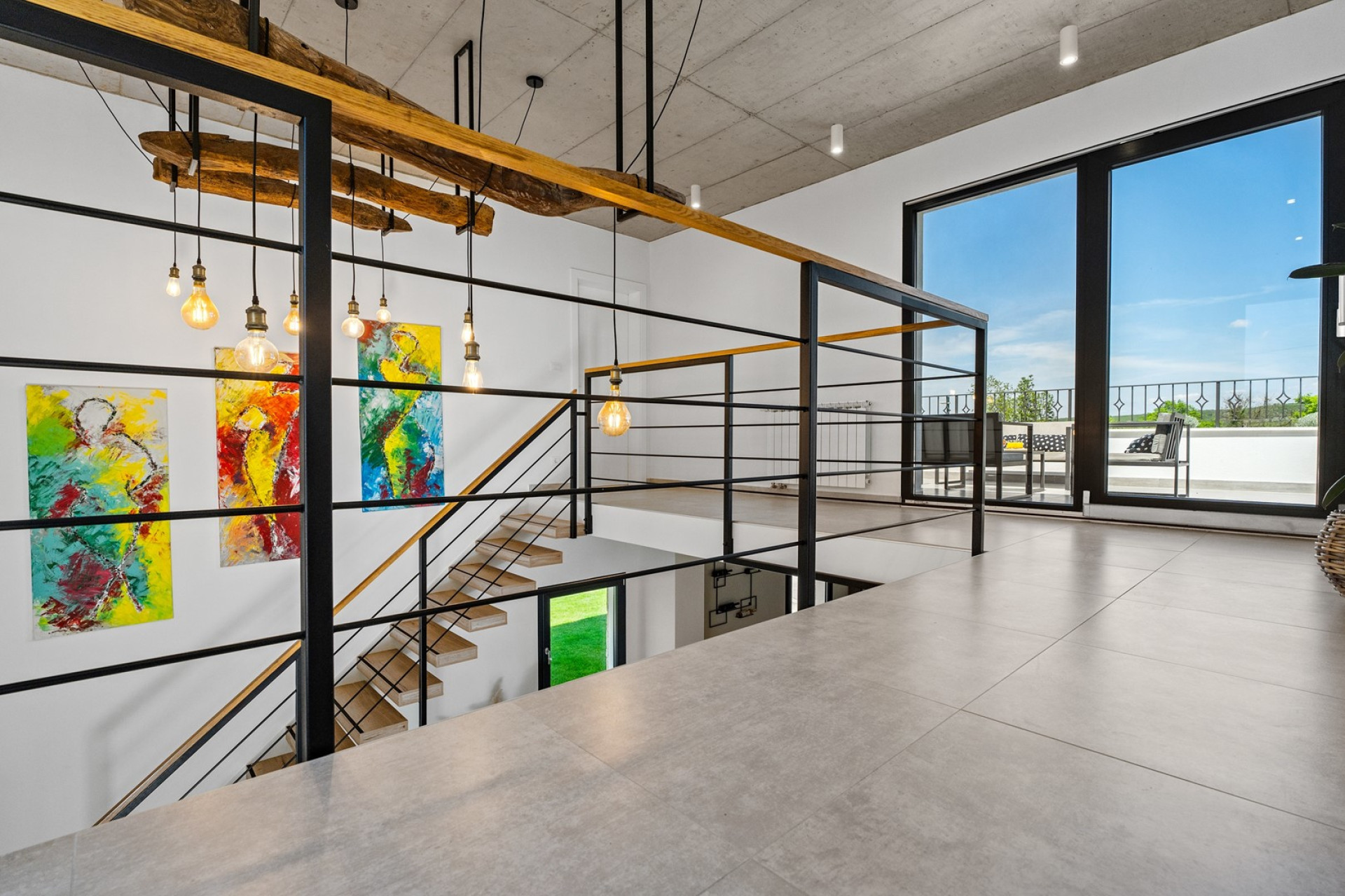 An internal staircase takes you to a bedroom area on the first floor that contains Bedroom NO1 with a king-size bed 180x200cm + a sofa bed for 1 person, A/C, TV, and en-suite bathroom with shower. Bedroom NO2 with two single beds 90x200cm, A/C, TV a Play Station 4, an en-suite bathroom with shower. Bedroom NO3 with king-size bed 180x200cm + a sofa bed for 1 person, TV, A/C, and en-suite bathroom with shower. From the hallway you step on two spacious terraces, one on the South, and another on the Northside, both with lounge outdoor furniture and views on the greenery and fields, a perfect spot for lazy evenings and watching stars, since the skies here are clear from urban lights.