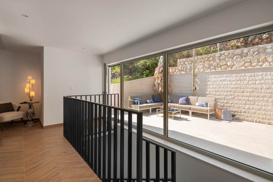 The FIRST floor indoors features an amazing panoramic view of the sea and island Brač, as well as a modern open concept kitchen and living room with exterior glass walls connecting you with the pool area. Fully furnished living area with sofa, a projector with the receiver (as a TV), and dining table for eight guests makes for an incredibly comfortable stay. Adjacent to it is a wine bar featuring a wine cooler, a home bar table, stools, and fully equipped kitchen with all the appliances a modern guest desires for a relaxed stay. A separate family bathroom with a shower is also available.