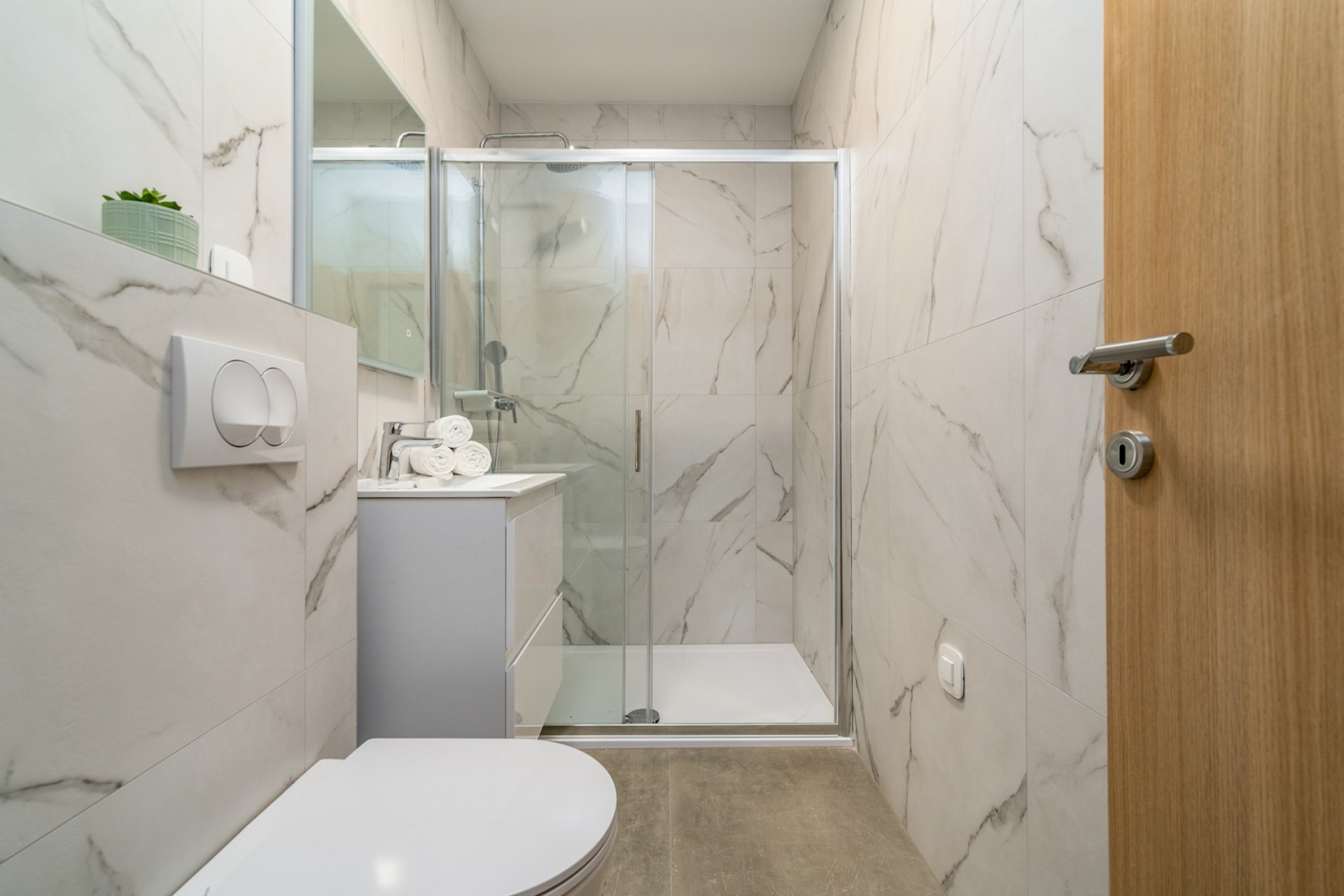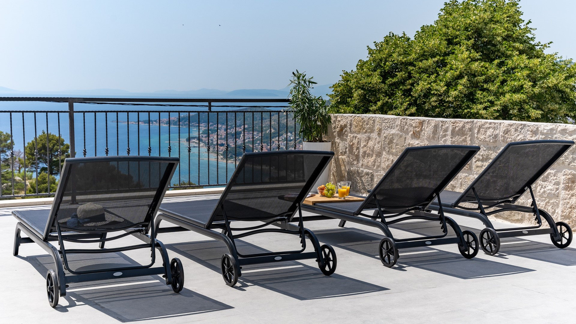 * The OUTDOOR area offers a stunning 24.5 sqm (7x3.5m) swimming pool with hydromassage overlooking the sea and Omiš. The outdoor area (West orientation) includes a spacious sun deck area with 8 lounge chairs, an outdoor shower, 2 sun-umbrellas, and an outdoor dining area for 8 people where you can relax at any time of day or night. There is a small playground with a slide and some toys for your youngest. A traditional barbecue is located next to the main entrance to the house, next to the outdoor dining area.