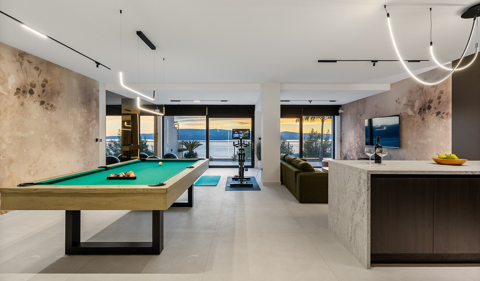 - An indoor staircase leads down to the spa and fun zone, which covers 77 sqm and is accessible via both indoor and outdoor staircases. This area includes a kitchenette with a small fridge, freezer, dishwasher, sink, glasses, and dishes, as well as a kitchen island. The indoor entertainment zone features a billiard table, a cosy sofa with a TV, and a gym area equipped with a multifunctional machine, exercise bike, weights, Pilates ball, and yoga mats. Wellness amenities include a Finnish sauna with a walk-in shower and a separate toilet. There is also a laundry room with a washing machine, dryer, ironing board, and iron.
