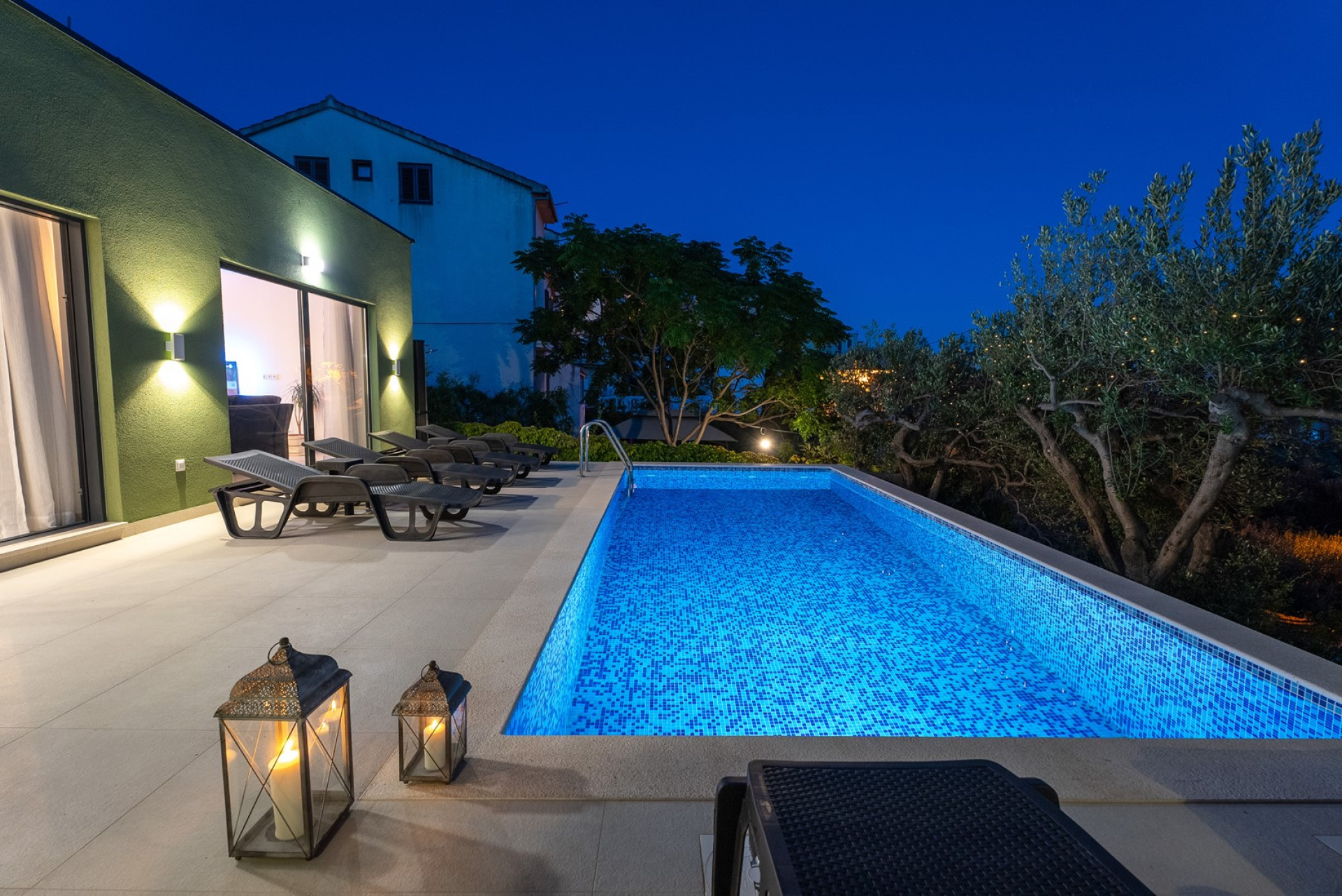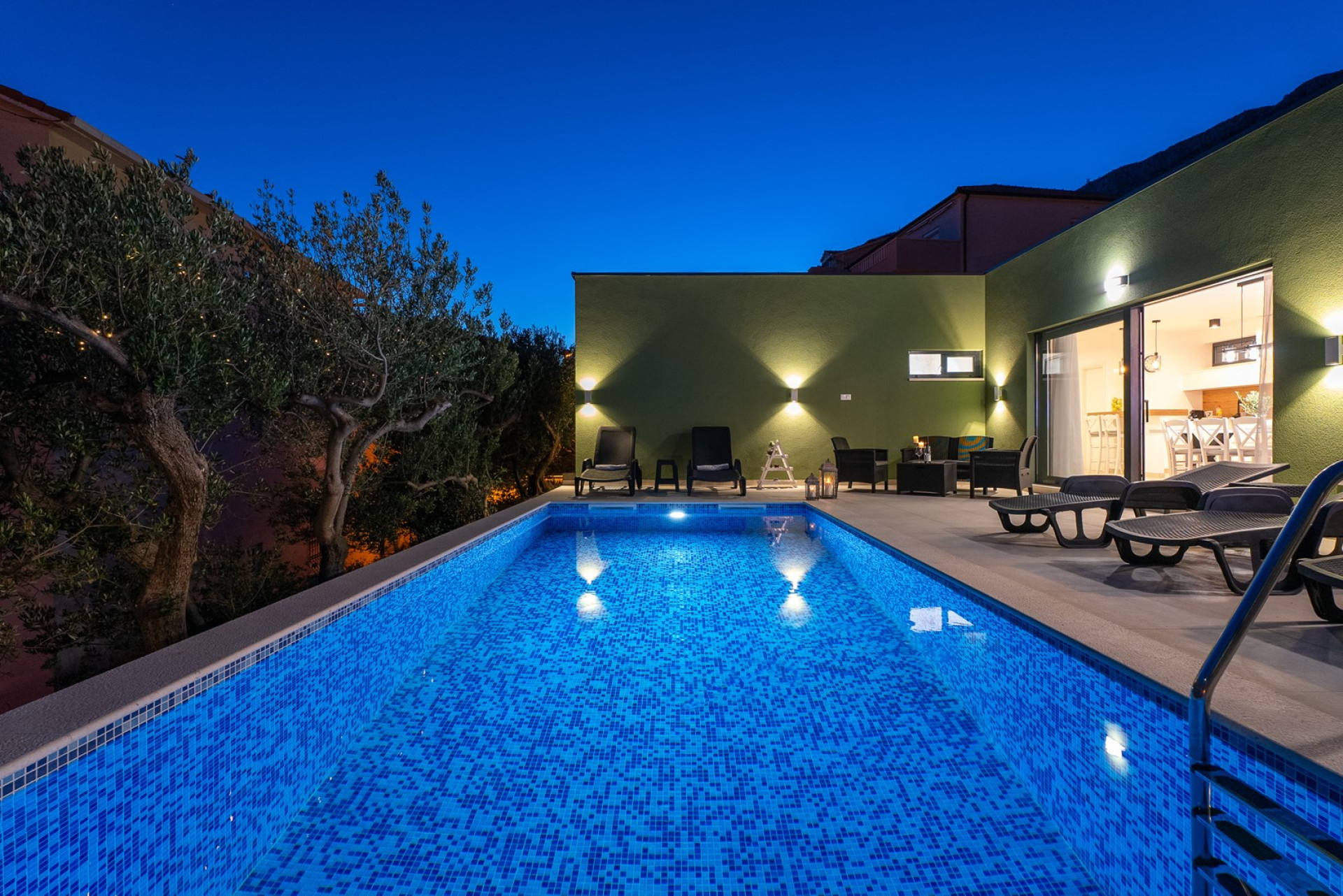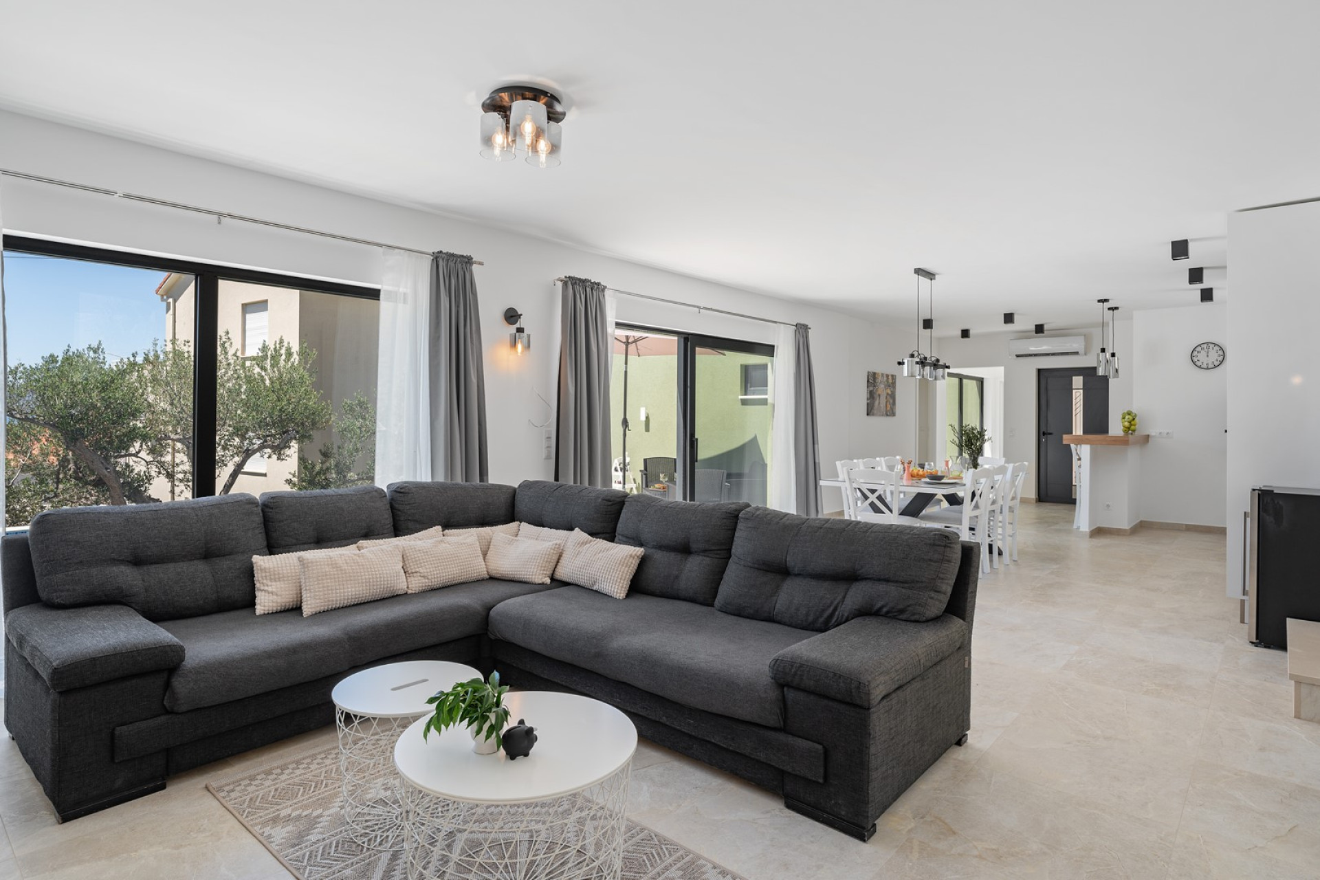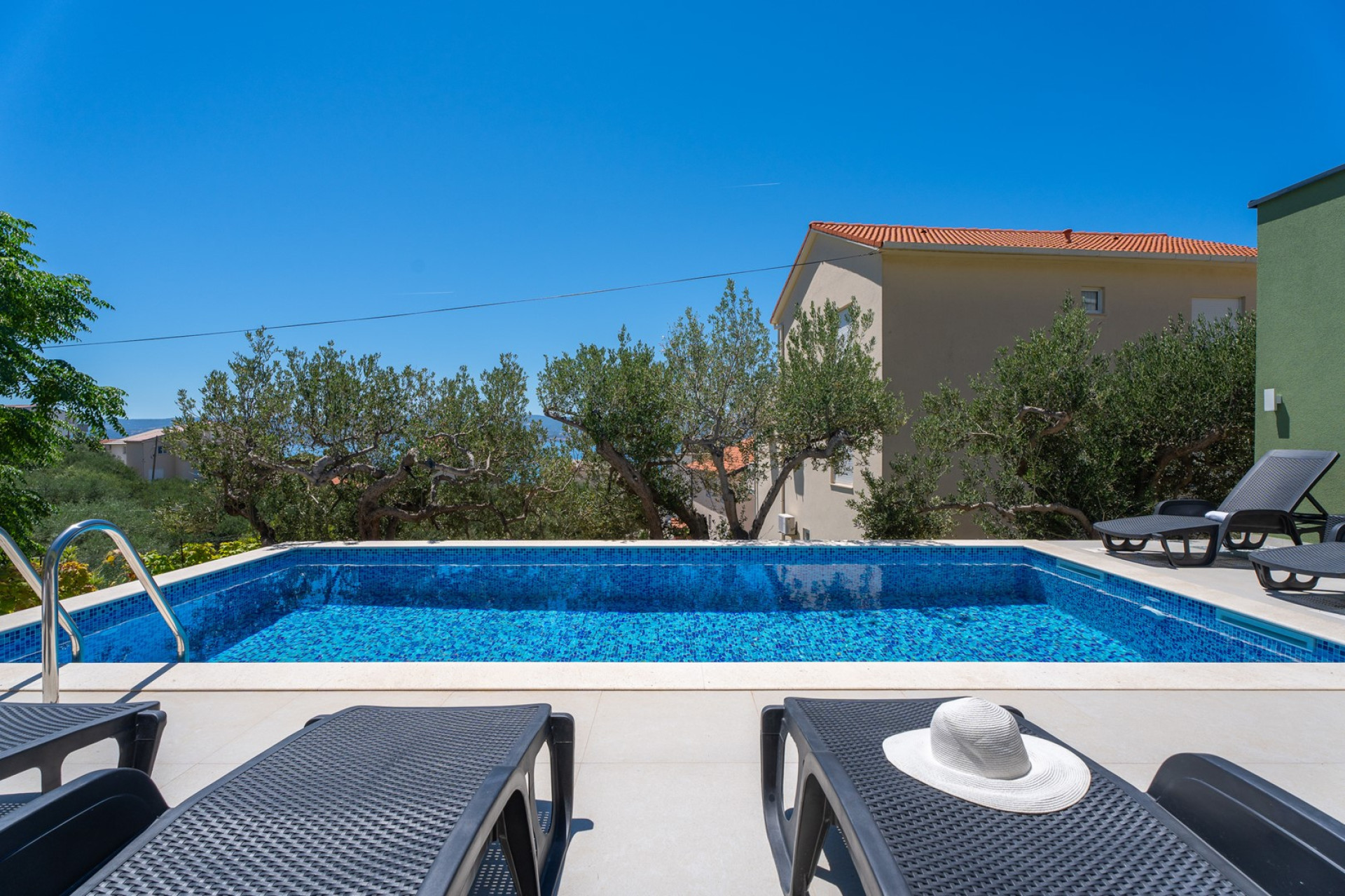Welcome to your luxurious retreat in the beautiful Omiš and Duće areas, where relaxation and comfort await you at every turn. This stunning villa boasts four spacious en-suite bedrooms, ensuring a nice getaway from a busy life surrounded by olive trees in a friendly neighborhood. Villa Verde is positioned above the coastal road in Duće-Rogač and offers 2 parking places on private property. Holiday house Verde spreads over 165 sq m of living area organized on the ground floor, is fully air-conditioned with free WiFi, and is settled on a private, fenced 440 sq m property.