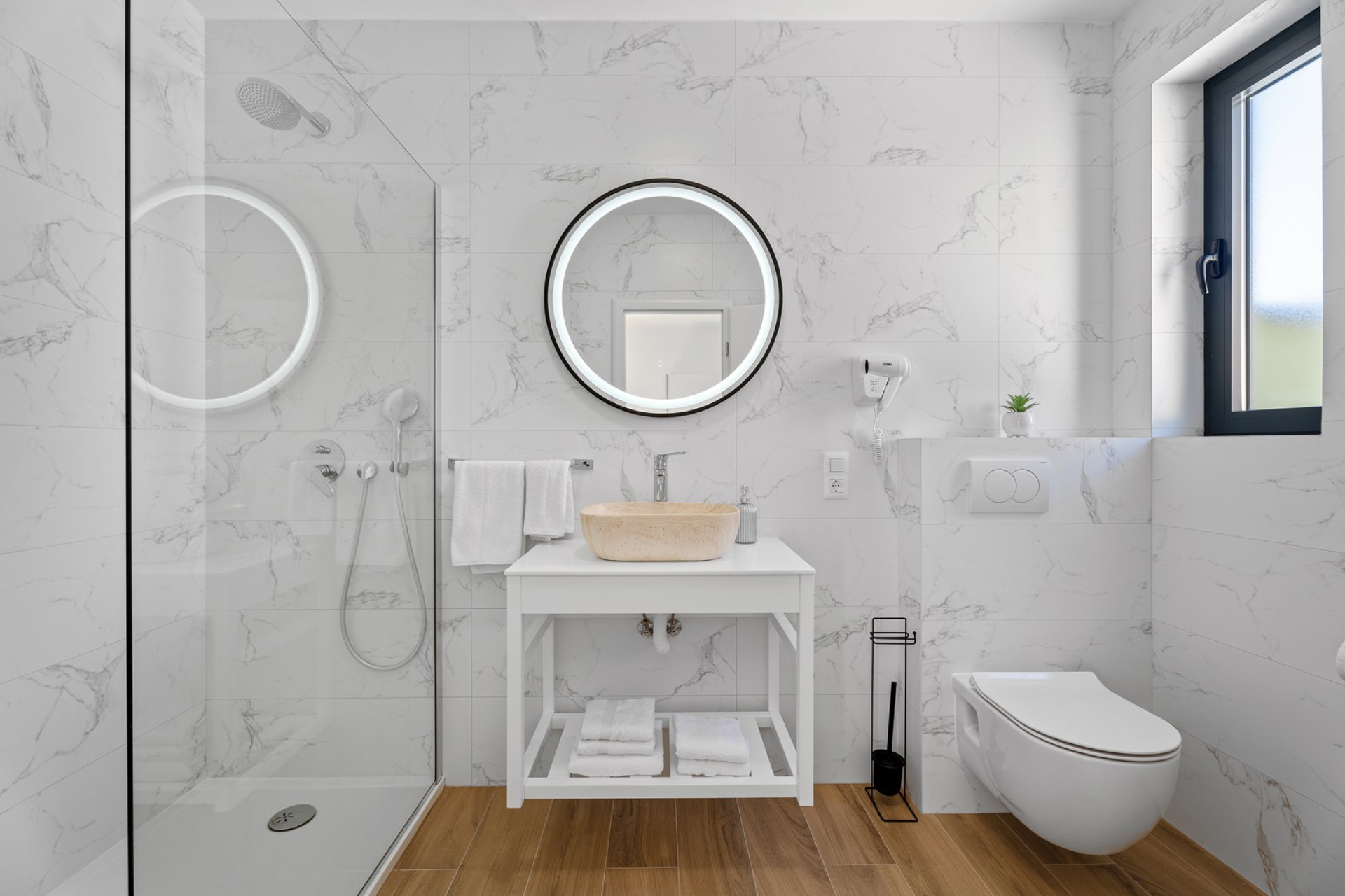 As you step inside, you are greeted by a bright and airy open-plan kitchen and living room (38 sq m), perfect for entertaining or simply unwinding after a day of exploring the nearby sandy beach. The modern kitchen is fully equipped with top-of-the-line appliances, making meal preparation a breeze, with a sliding glass door toward the pool area. There are 4 bedrooms, each offering a queen-size bed (160 cm x 200 cm), air conditioning, and an en-suite bathroom with a shower.