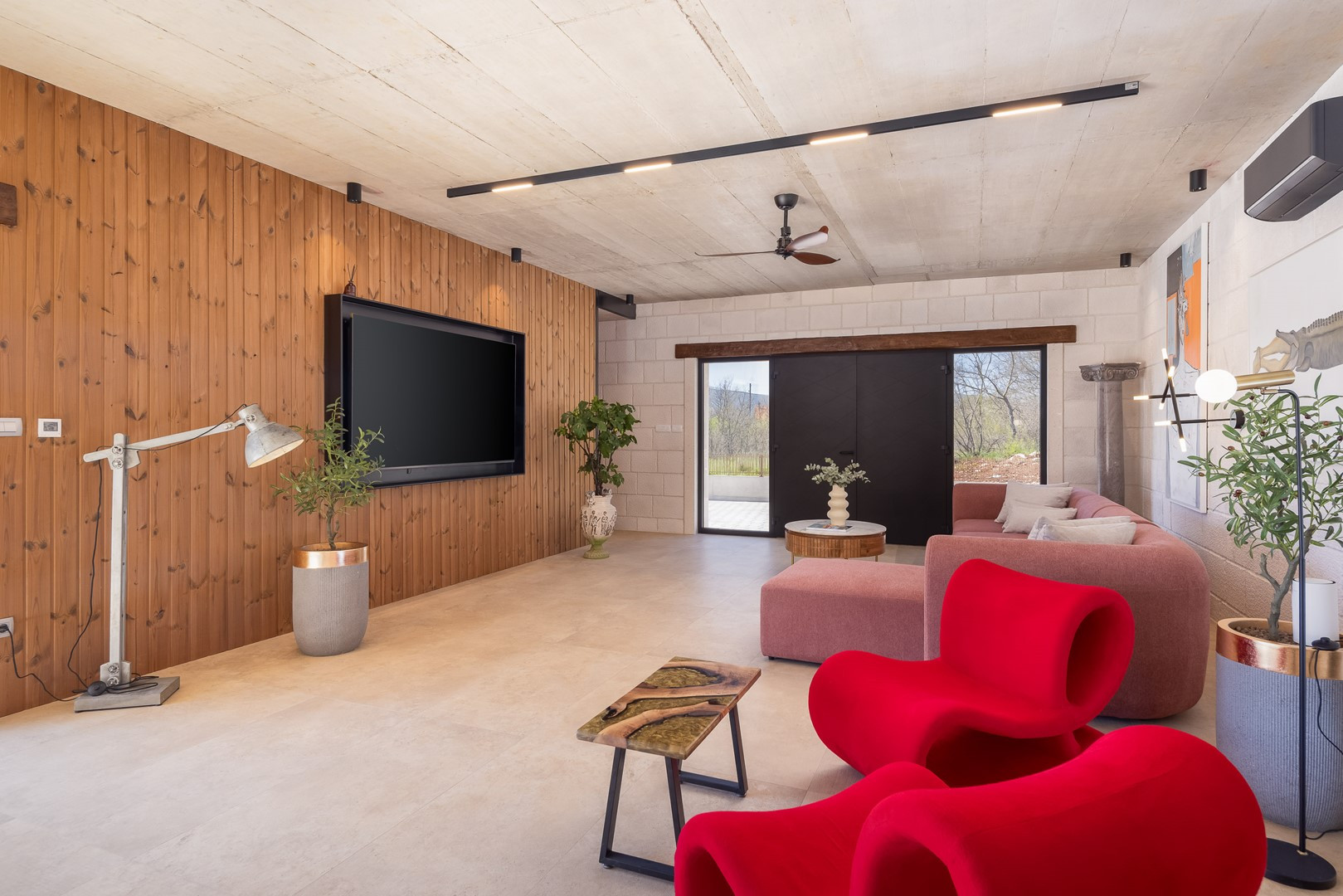 Set on a generous 3,400 sqm private plot, Villa Fantazija features 240 sqm of beautifully styled interiors across a single level. The open-plan living and dining area (80 sqm) boasts comfortable sofas, a flat-screen smart TV, and a fully equipped kitchen, perfect for preparing delicious meals. The dining space accommodates up to 8 guests and opens up with sliding glass doors to the stunning outdoor areas, seamlessly connecting indoor comfort with nature's beauty.