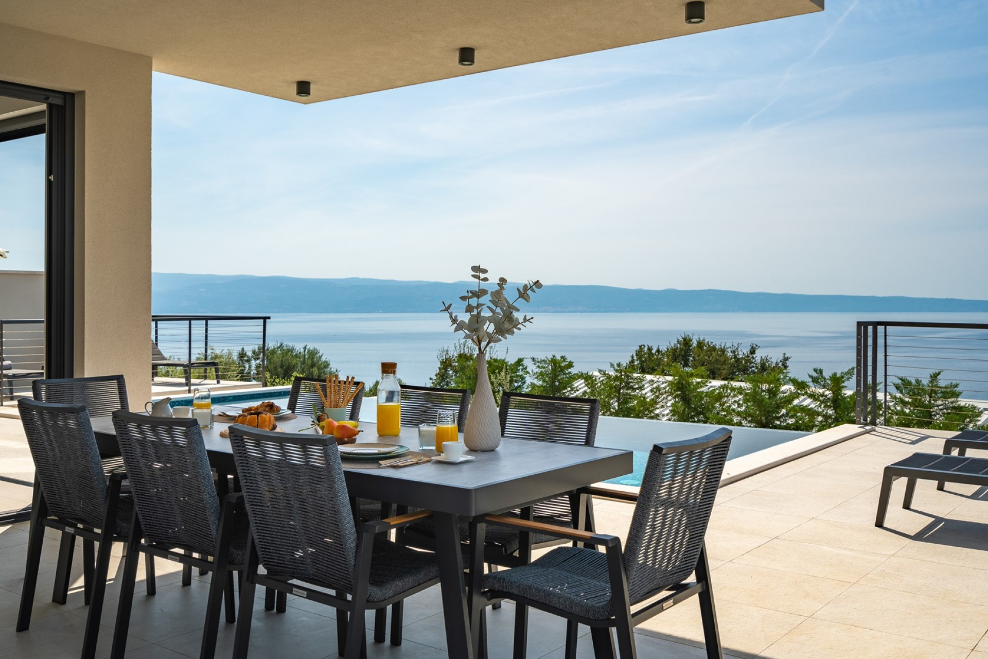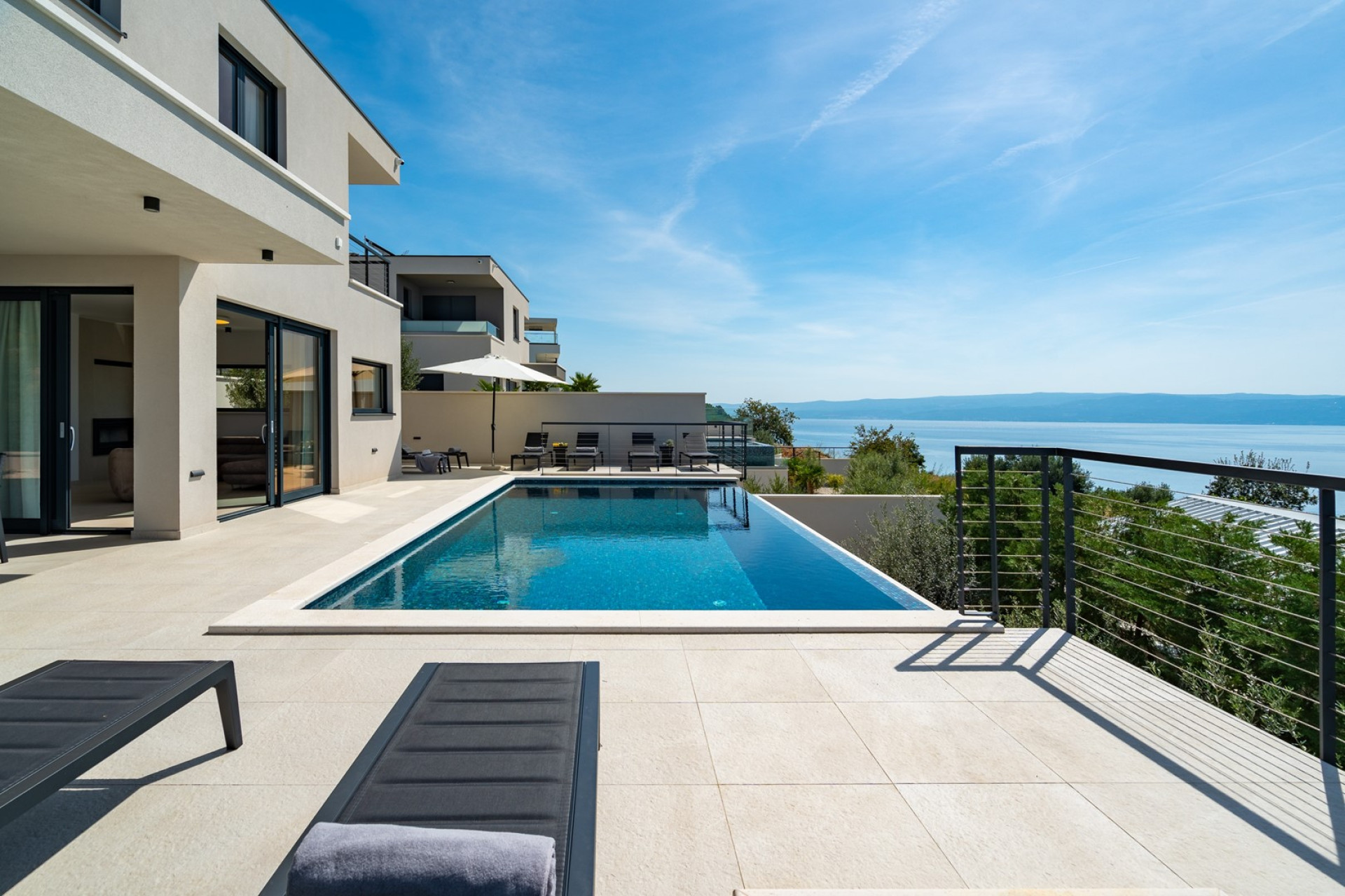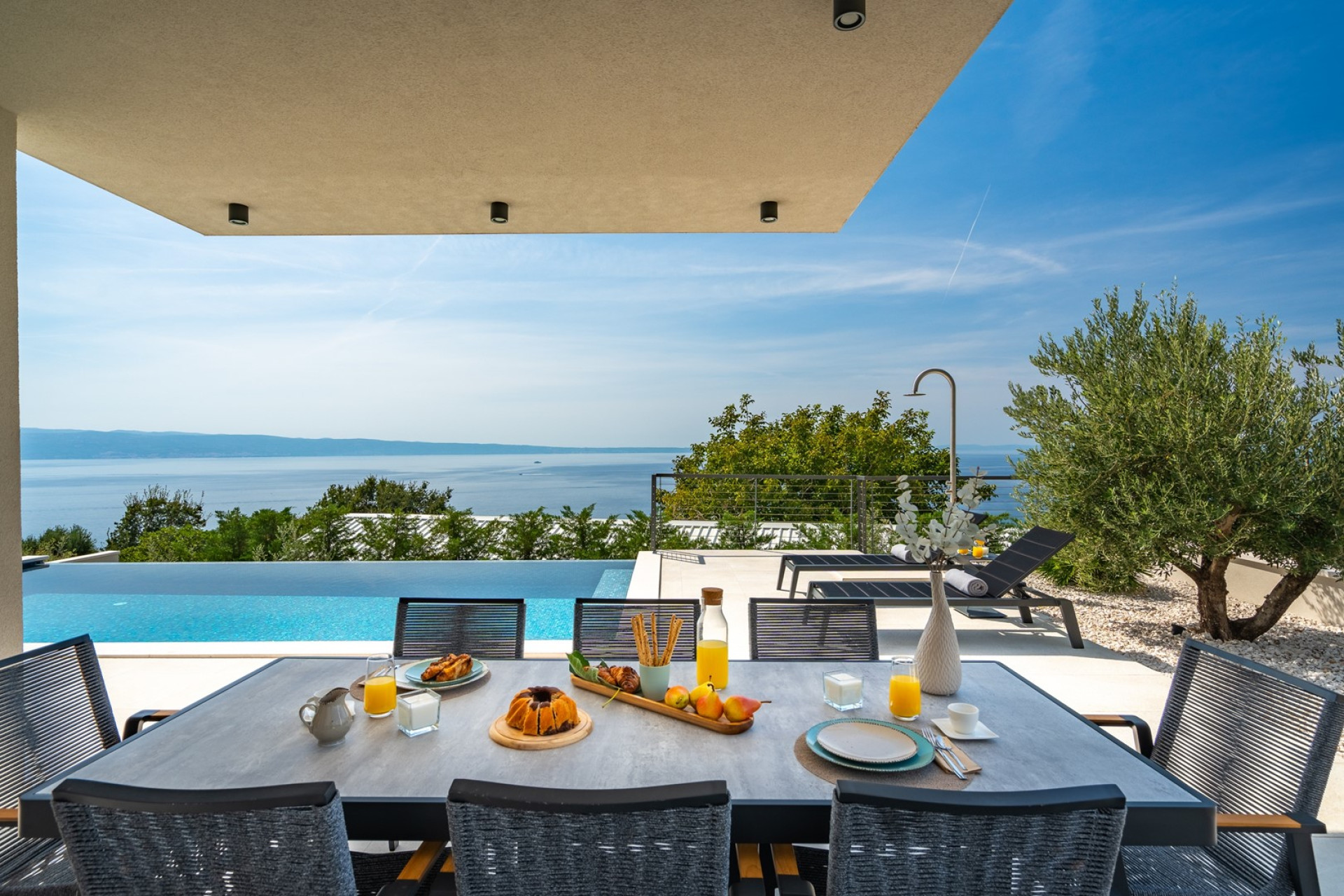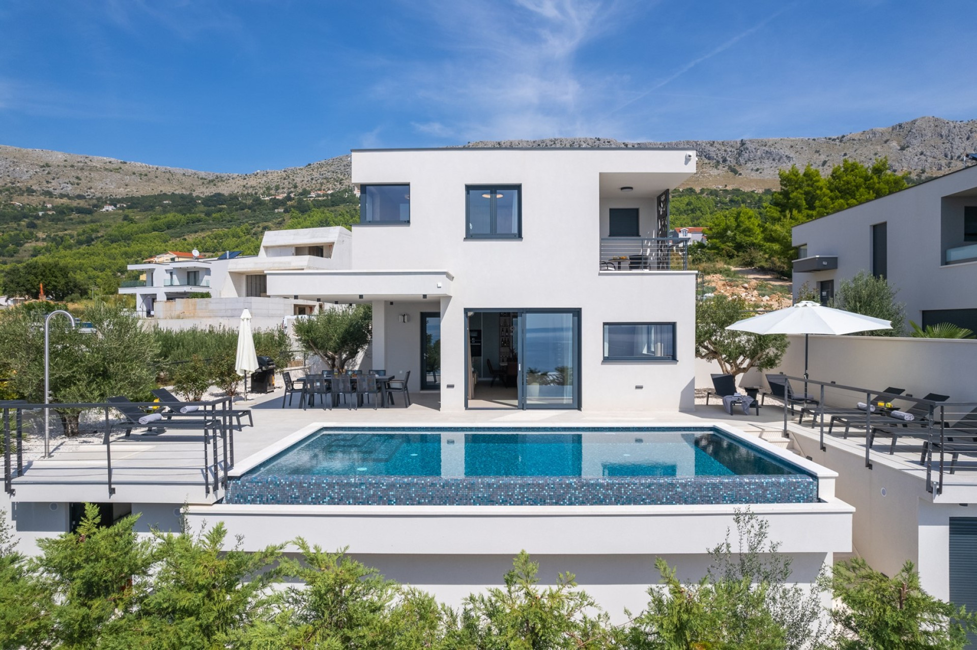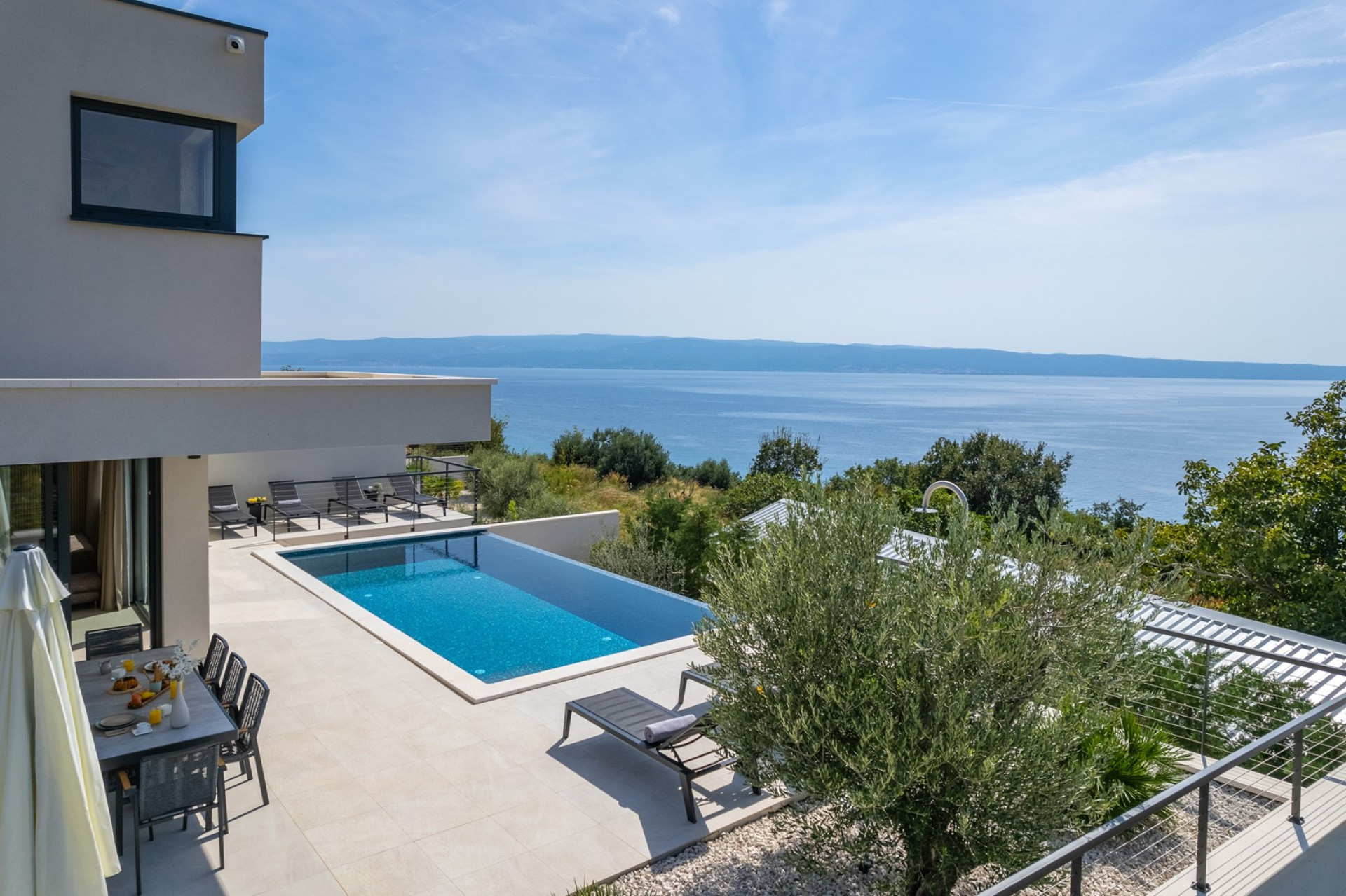 *Der AUSSENBEREICH bietet einen privaten und beheizten Infinity-Pool von 32 m² (8 x 4 m) mit einem vollautomatischen Salzelektrolysesystem, 8 Liegestühlen, einer Gasgrill. Die Villa ist von Olivenbäumen umgeben. Vor dem Ess-/Wohnzimmer gibt es einen überdachten Essbereich für 8 Personen und eine sehr komfortable Sonnenterrasse, überall haben Sie Meerblick.