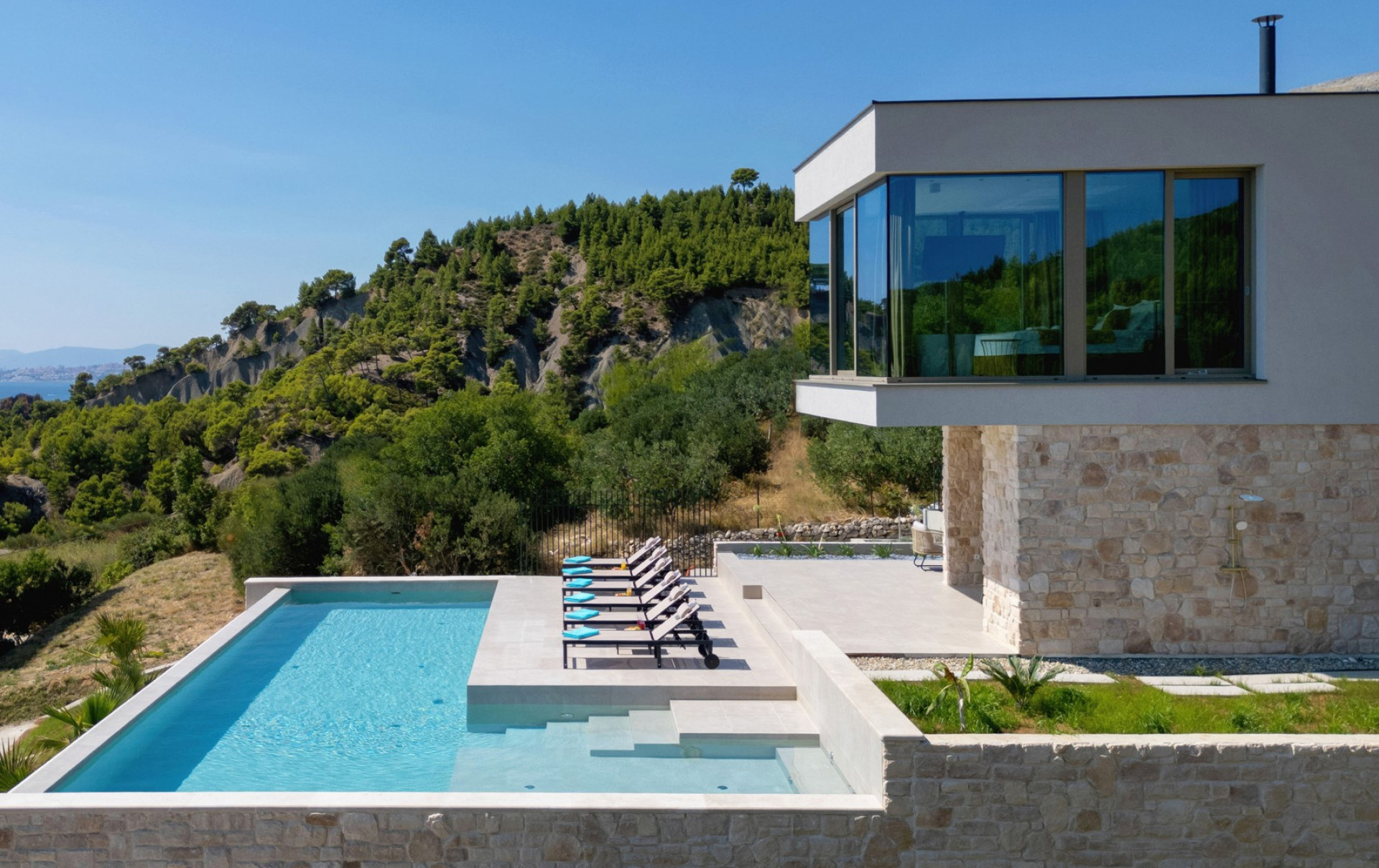 Inside, find a fully equipped modern kitchen featuring an island with high-end appliances, including a JURA E8 coffee/cappuccino maker. A stylish dining area comfortably seats 8, and the spacious living room invites relaxation with its plush sofas, flat-screen TV, and sliding doors that open to the pool area with magnificent sea and neighbourhood views.