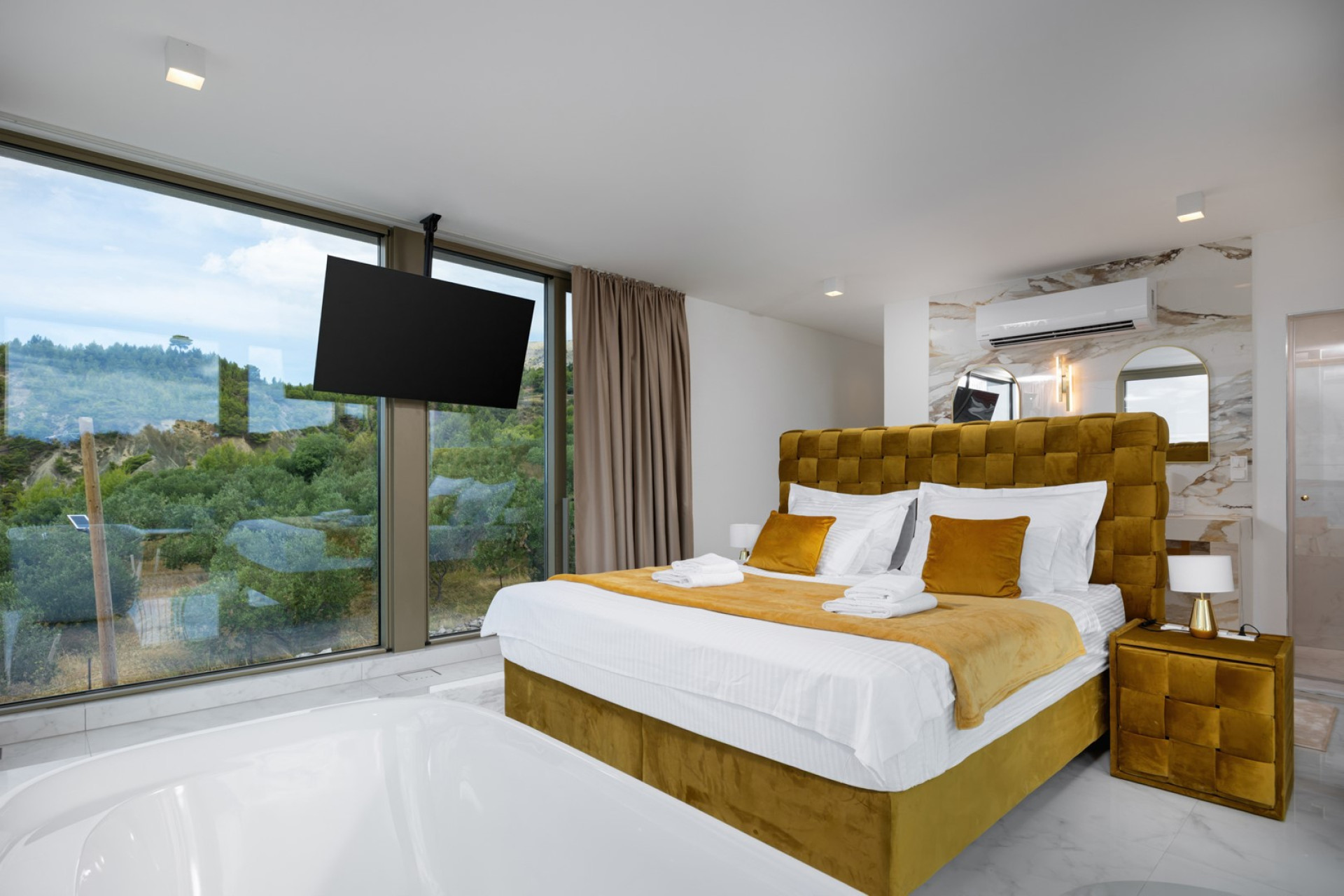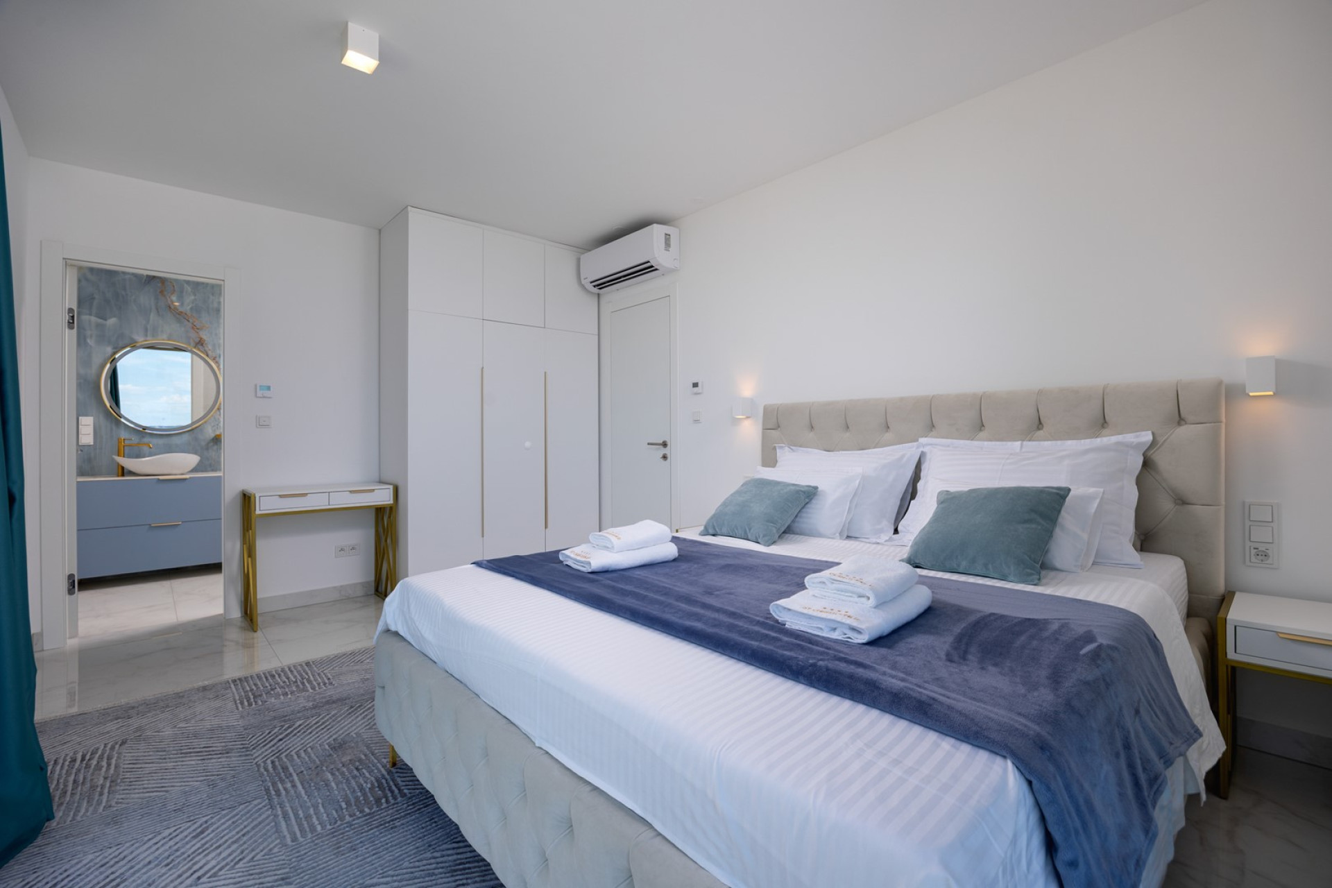 - Bedroom 1 (30 sqm, South-facing): King-size bed (180cm x 200cm), air-conditioning, TV, walk-in wardrobe, en-suite bathroom with shower and freestanding bathtub, spectacular sea and pool views.