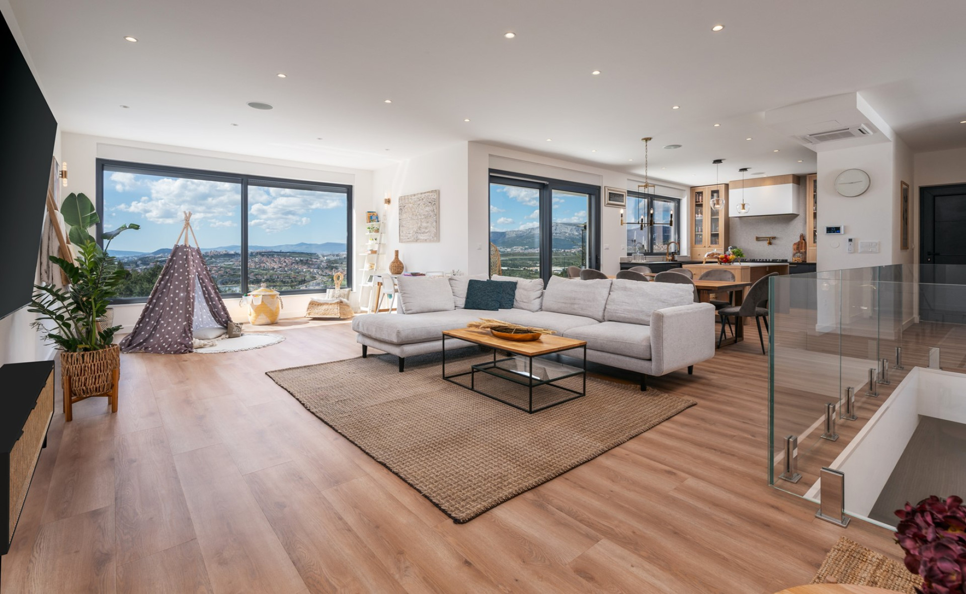 *The first floor (parking level) offers a contemporary open concept kitchen and living room (66 sqm) with external glass walls and a spacious terrace with a lounge and a hang egg chair, amazing panoramic views of the sea and Split town. A fully equipped kitchen with an island and all a modern guest needs for a very comfortable stay with some great cooking features, a kitchen island, a dining table, a living area with a sofa, smart TV, a reading corner, and a children's corner with some toys and fun zone. There is also a separate toilet.