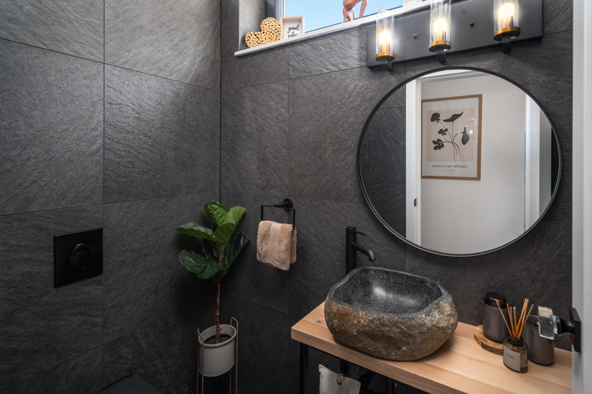 *The outdoor (lower ground floor level) offers a private, heated 32sqm pool (8m x 4m) with a fully automated salt electrolysis system, 6 deck chairs, a hammock for two people, a lounge corner with a fire-pit, an outdoor shower, covered dining area, a bar table and a barbecue (gas and charcoal BBQ). Spacious sundeck area with artificial grassplot and some extras for your youngest (basketball hoop, a football goal, a swing and a slide)