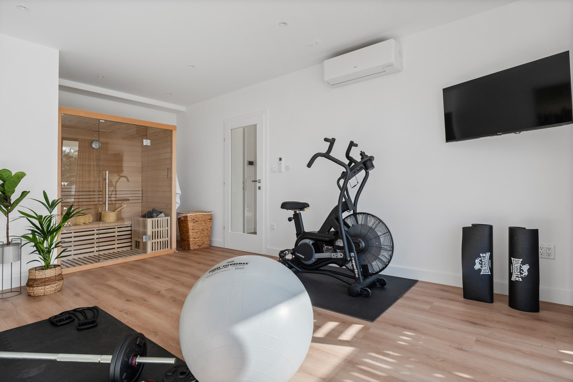 *At the ground floor (pool level), you will find a fully equipped kitchen with a kitchen island (26 sqm), a smart TV, a sofa, and a direct approach to the pool area and outdoor dining area. There is also a relaxing zone for your soul and body with an indoor Gym area with a Finnish sauna (25sqm), smart TV, and door toward the pool area. In the hallway is a separate bathroom with a shower.