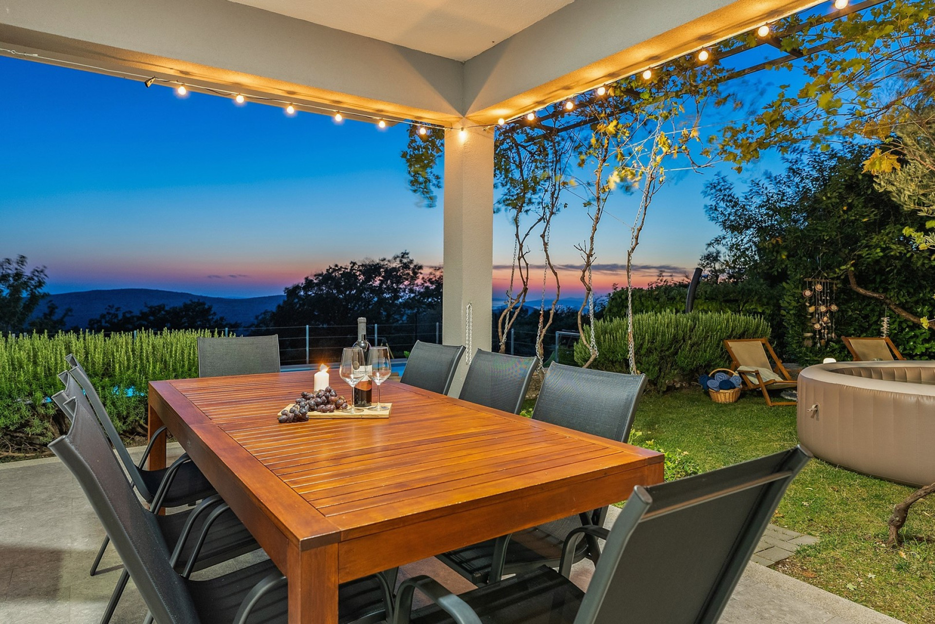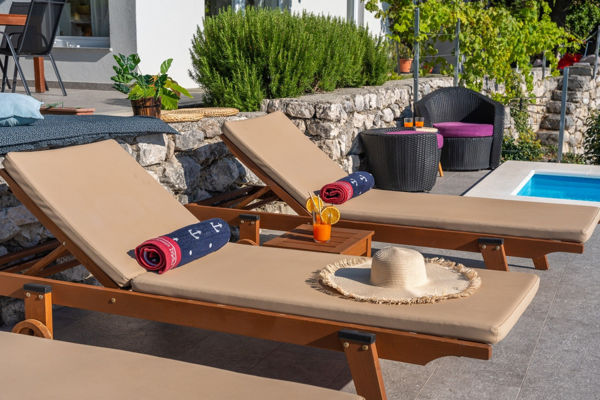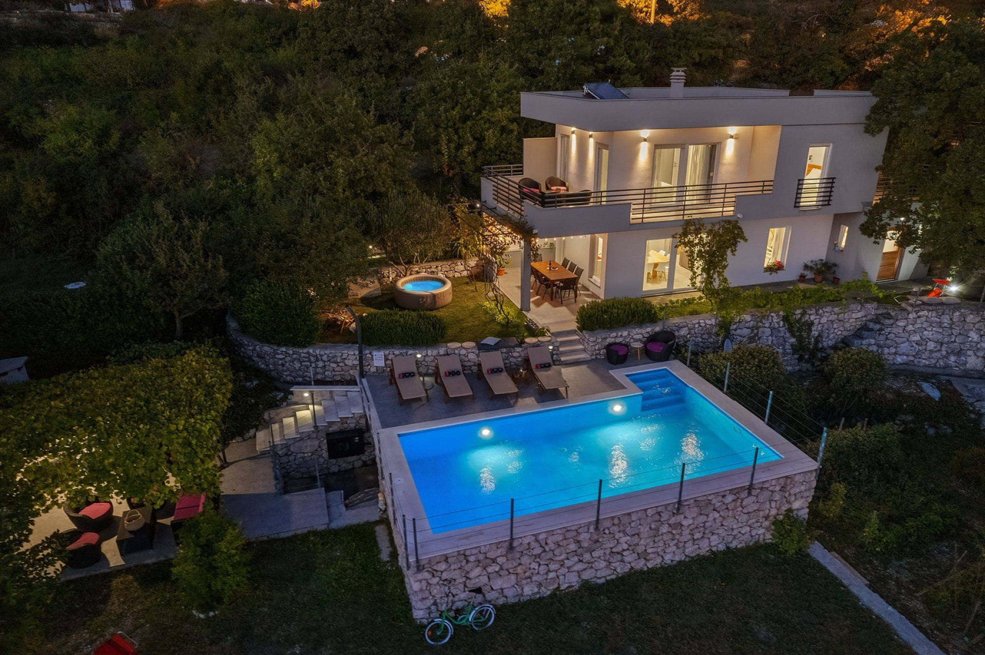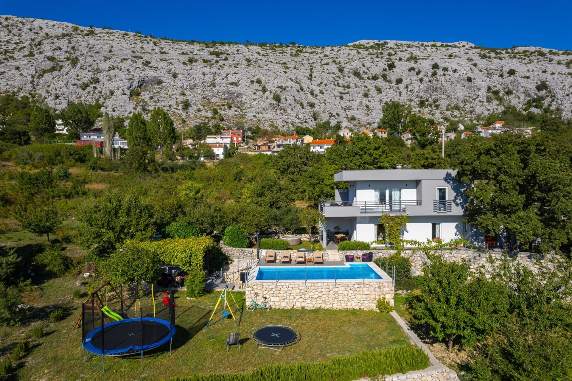 Villa Up is a 4-bedroom villa located on the slopes above the town of Split (25min), in Gornje Sitno village. It can comfortably accommodate 8 people and it offers a private and heated 33sqm pool, a Softub Whirlpool, a covered outdoor dining area, a lounge corner with a BBQ, a Playground with a trampoline, and a very comfortable interior overlooking the pool area, sea in the distance, and a beautiful natural environment. Villa UP consists of 175 sqm of interior nestled on a 980 sqm fenced property. Villa UP is beautifully decorated and furnished with high-quality, offering various lounge corners with natural shade to provide you with a perfect home-away-from-home in this indeed unspoiled environment of the Gornje Sitno village. There are 2 restaurants within a short walking distance that offer local traditional food, a mini market is 300 m away from the villa with limited offers, and the nearest supermarket is 10km away. Close to the villa (around 200m) is a mountain trail toward the mountain lodge Umberto Girometta, where many people from the town of Split hike for the weekend escape, and that will keep you in shape and offer a new experience.