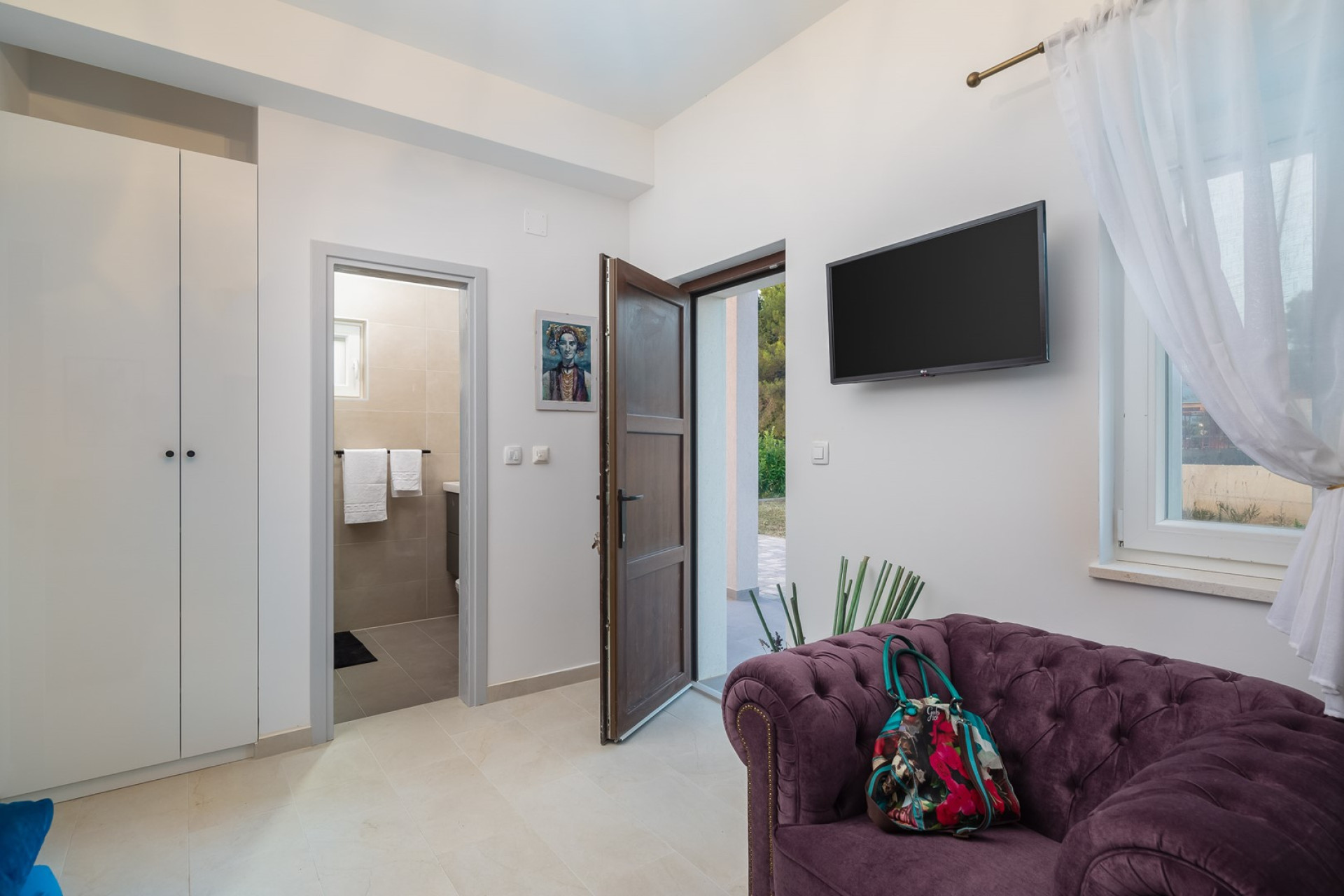 Bedroom No. 3 (13sqm) also boasts a queen-size bed (160x200), with air conditioning, a TV, and a balcony overlooking the picturesque sea and pool. A separate terrace with two deck chairs on the northwest side provides a tranquil spot to unwind.