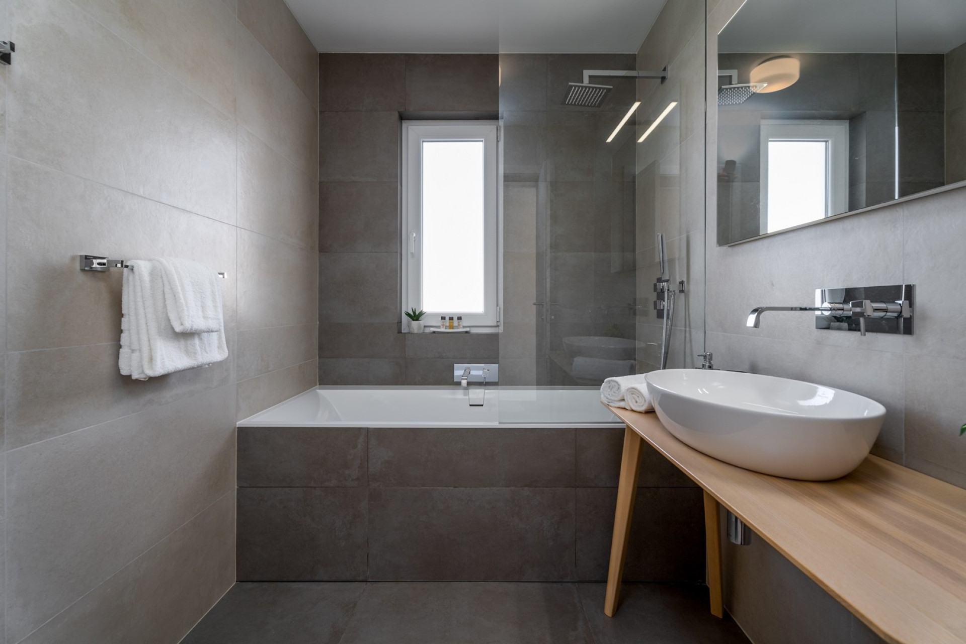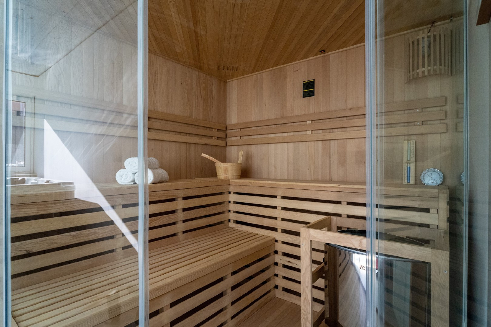 * The LOWER GROUND floor is approached by an internal staircase where you have an anteroom with sofas for relaxing after using the comfortable Finnish sauna or a Hot-Tub with pool views that are located in a 16sqm room next to the anteroom. There is also a Bedroom No4 (13sqm) with a queen size bed 160cm x 200cm, air-conditioning, a TV, an en-suite bathroom with a shower (3,5sqm), the views are from the parking lot and the garden.