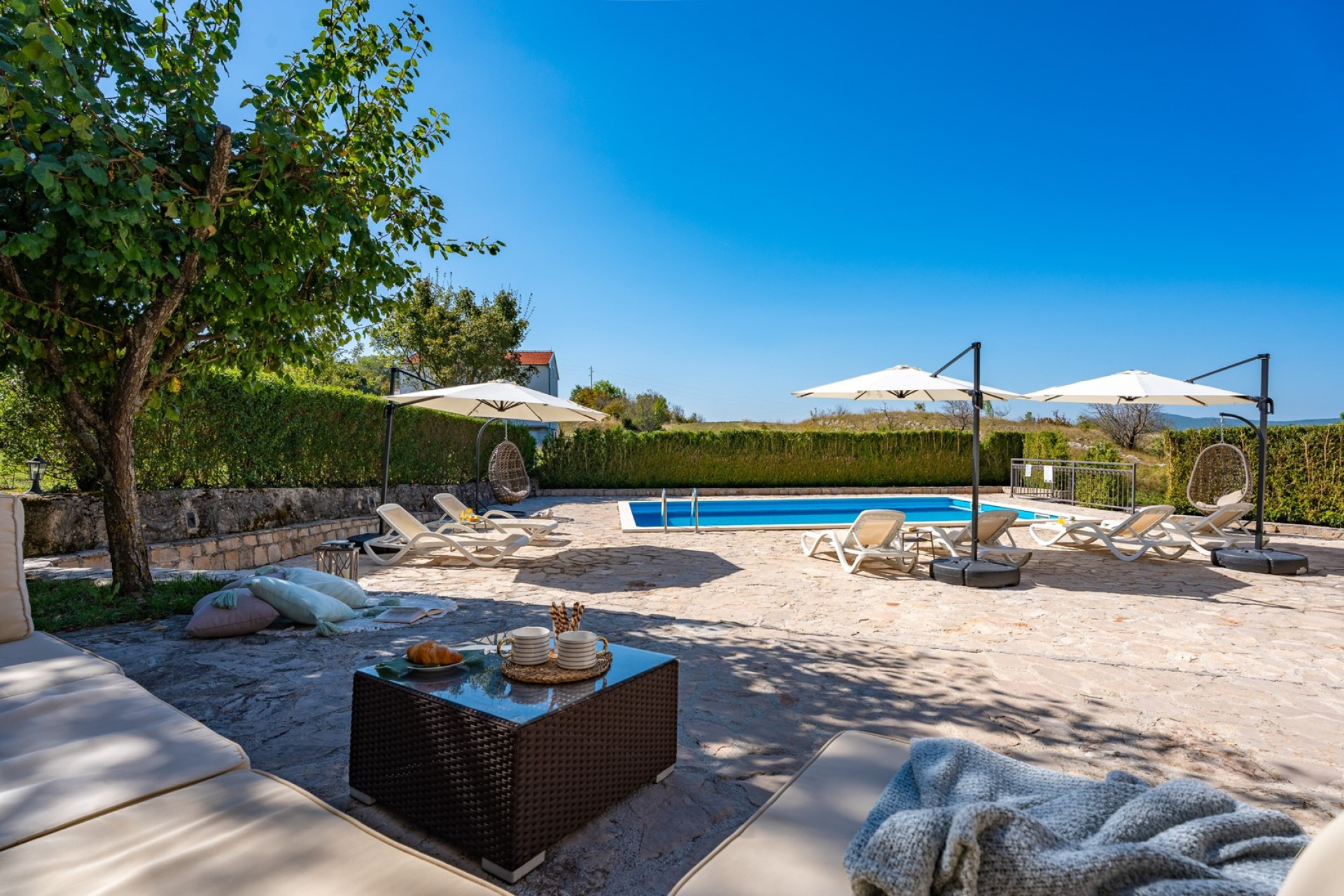 -The OUTDOORS offers a private and heated swimming pool 10m x 4.5m, a spacious sun deck area with 8 deck chairs, 3 sun umbrellas, a lounge corner next to the stone house, 2 swings, a Table Tennis behind the house and next to the covered outdoor dining area and traditional barbecue which is a perfect spot for the family evenings showing your grill skills. The villa offers 8 mountain bikes for your use (no extra charge) with which you can feel free to explore 30-40km trails toward Imotski, enjoying this indeed unspoiled environment and beautiful nature. Many people are attracted by this opportunity and are arriving just to ride bikes.
