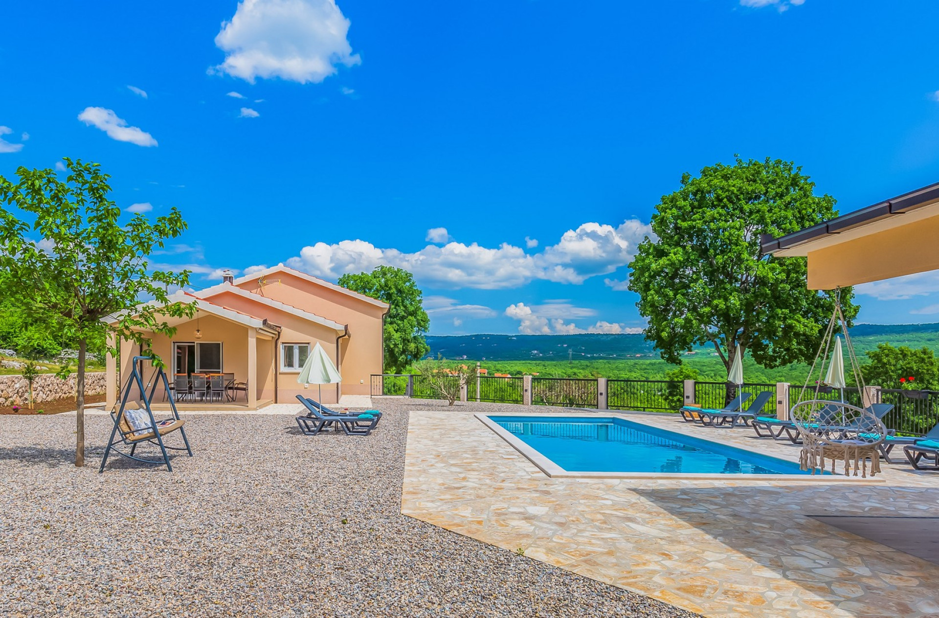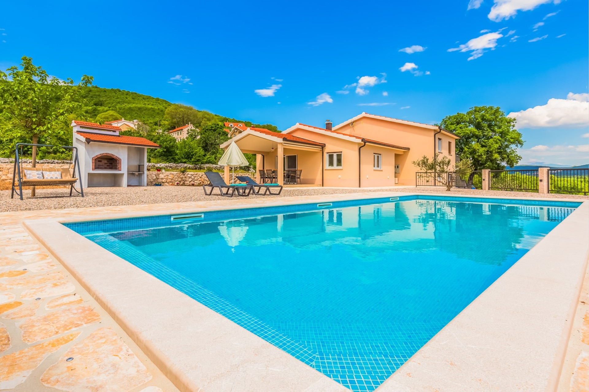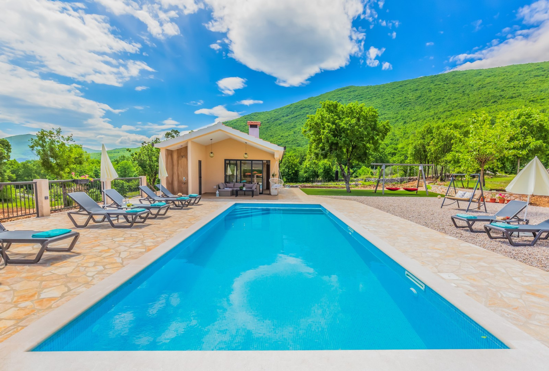New in our offer is this amazing property named Villa Patria, which is located in the Makarska hinterland in a small and peaceful village named Lovreć, near Imotski, only a half-hour drive to Pisak with amazing beaches. Villa Patria offers 4 bedrooms, 3 bathrooms, a summer kitchen with a Media room with PS4, a Gym with treadmill, exercising bike and table soccer, a private heated 10,5m x 4m swimming pool with hydro-massage, huge sun deck area with 8 deck chairs, a covered outdoor dining area with BBQ, playground with swings and a slide, and few hammock under the oak trees, all surrounded by unspoiled nature all around the property offering a very comfortable stay and absolute privacy.