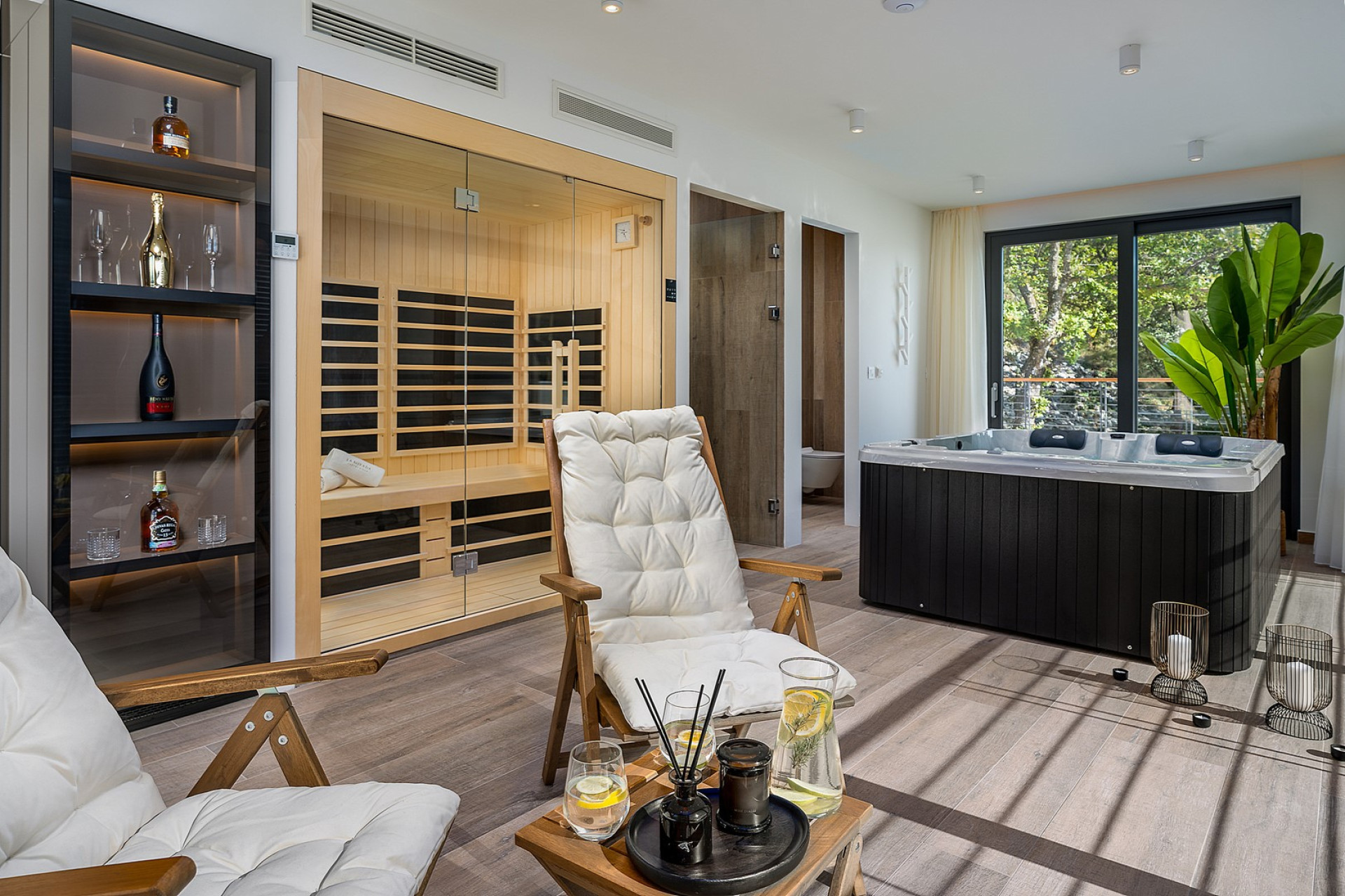 * The Rooftop (2nd-floor level) offers an indoor wellness area with an infrared Sauna, a whirlpool (Hot-Tub), a shower, TV, and a small kitchenette. A floor-to-ceiling glass window offers daylight in and a breathtaking view of the Omiš town, sea, and the Fortress Fortica above on the hill. On the East side, there is a terrace with an outdoor Treadmill, fitness mats, and weights, so you can start your day being active, watching the sunrise while hearing only the birds. On the West terrace is a half-covered relaxing zone with a lounge corner and outdoor furniture for enjoying spectacular sunsets with a glass of local vine.