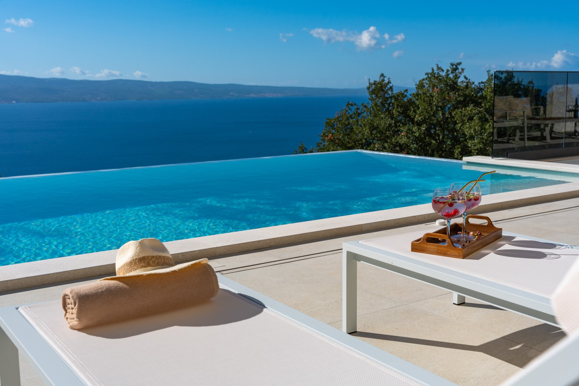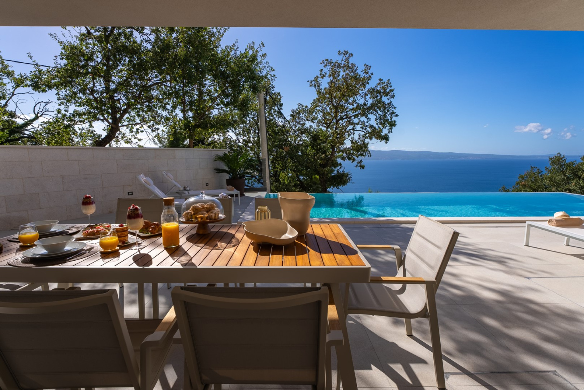 * The Outdoor offers a private and heated, infinity swimming pool 10m x 4,5m with hydro massage) with a Chlorine-Free water system that is gentle and much healthier for your body, a spacious sundeck area that is not overlooked with 8 deck chairs, a lounge area, a covered outdoor dining area with a barbecue (gas), and an outdoor shower. The pool area with ambient night lighting provides a soothing and peaceful background while enjoying the views of the town of Omiš underneath. Behind the house, there is a fenced playground with Table tennis, Badminton, and a kid's football net so your younger members can have some outdoor fun.