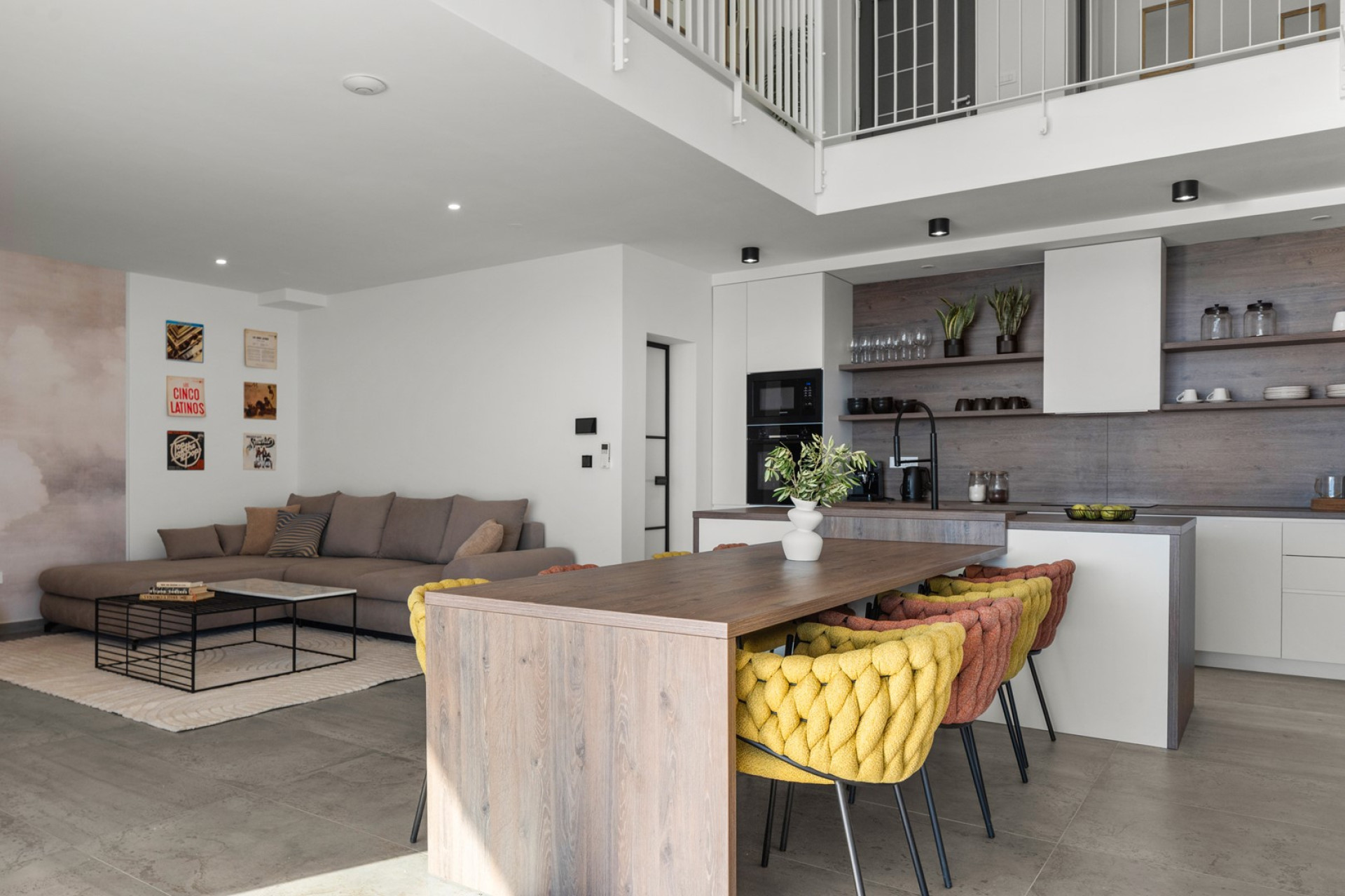Inside, the ground floor boasts a spacious 60-square-meter living area with full air conditioning, comprising a fully equipped kitchen with an island, a dining table, and sliding doors that open directly to the pool area. The living space features a comfortable sofa that can be converted into a bed for two, a smart TV, and a PlayStation 5, providing entertainment for all ages. A separate toilet with a sink, as well as a laundry corner with a washing machine and dryer, adds to the convenience. The ground floor also houses two bedrooms with en-suite bathrooms.