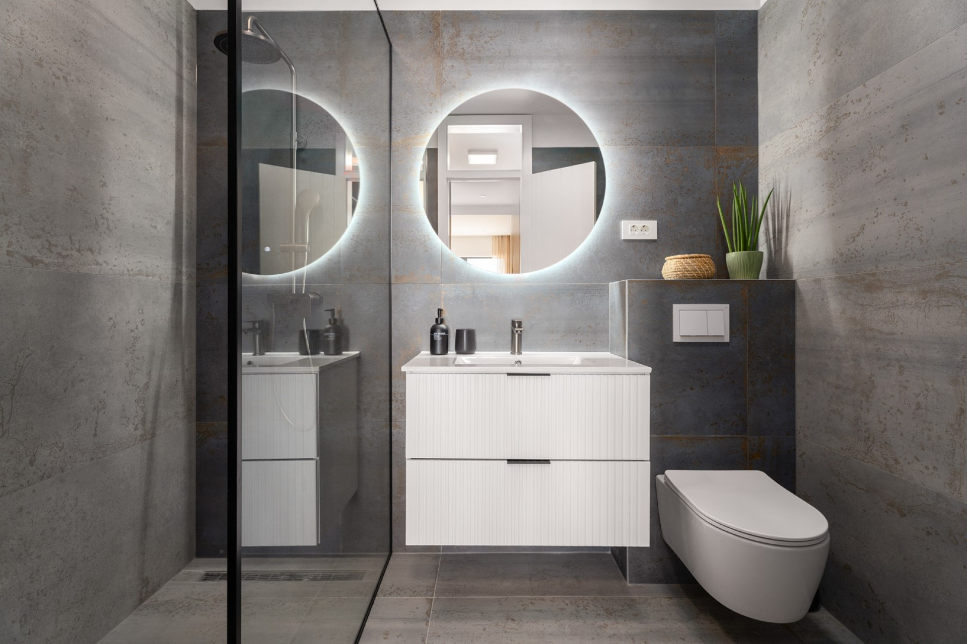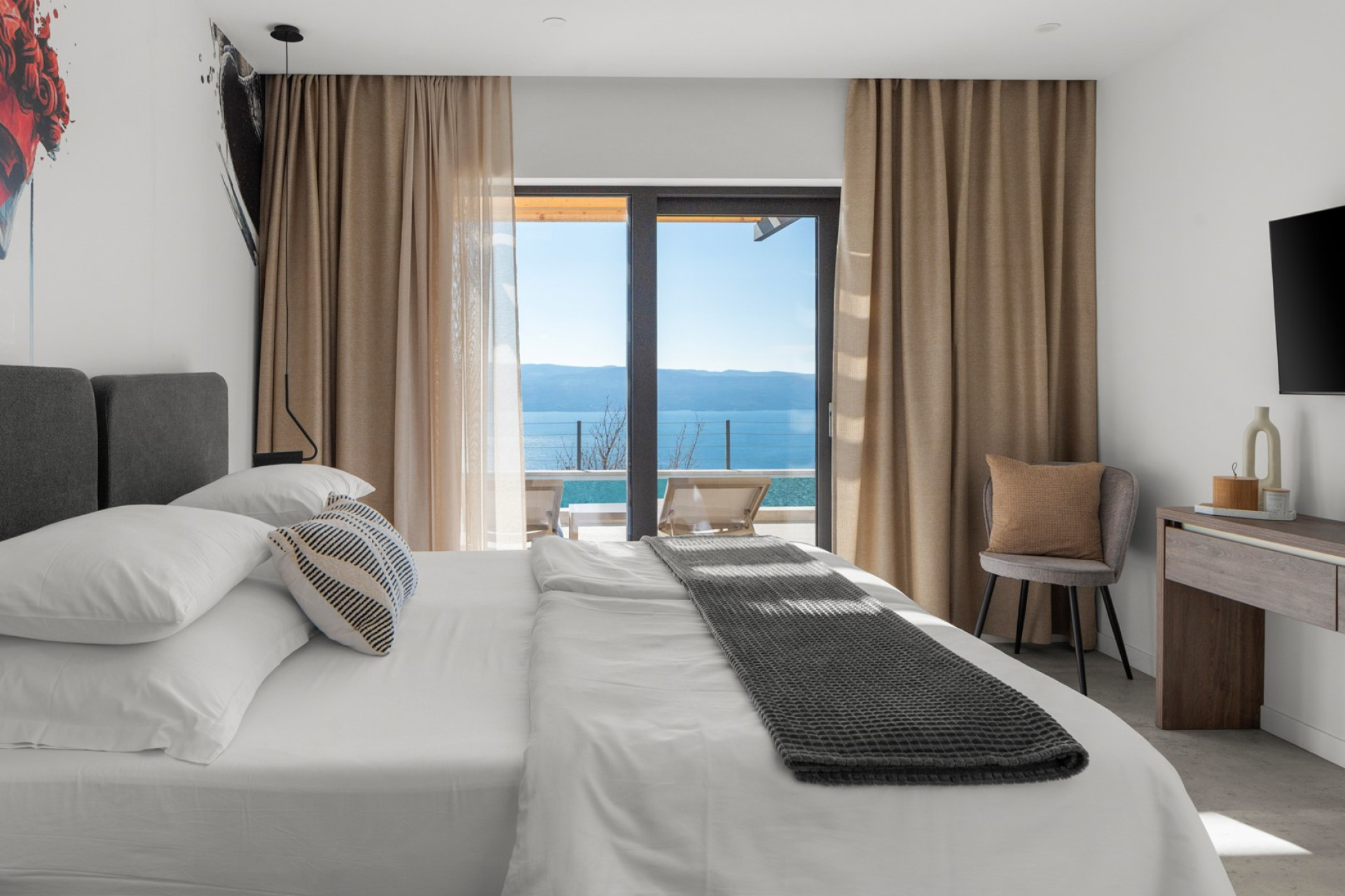 Bedroom No. 2, slightly larger at 24 square meters, also offers a king-size bed (180x200 cm), a walk-in wardrobe, a smart TV, and sea views, with its own en-suite bathroom.