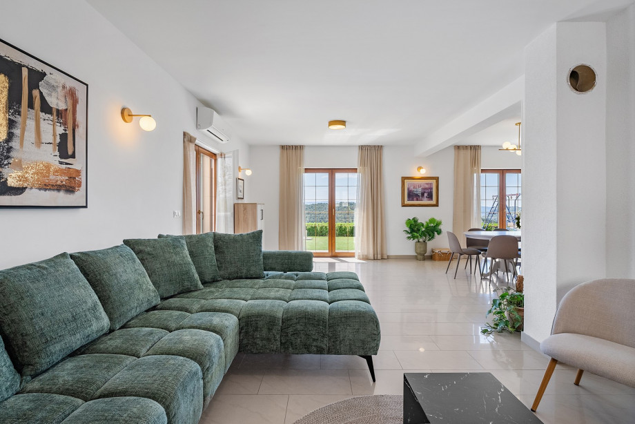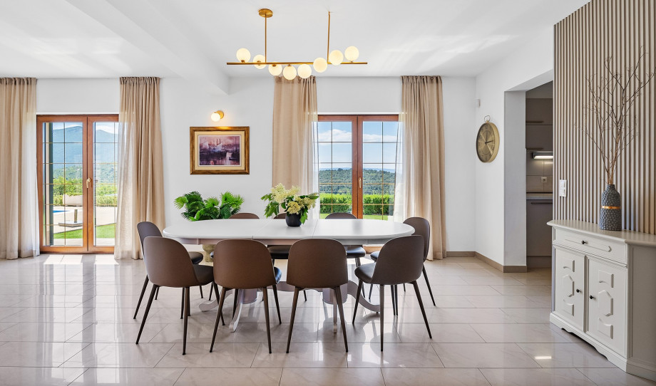 The interior of Villa Calma covers approximately 155 square meters and is divided into two floors. On the ground floor, there is an air-conditioned living room with direct access to the pool terrace, furnished with a sofa set and a flat-screen TV. The dining area, integrated with the living space, provides seating for 10 persons. The kitchen is fully equipped with all necessary cookware and utensils. This level also includes: