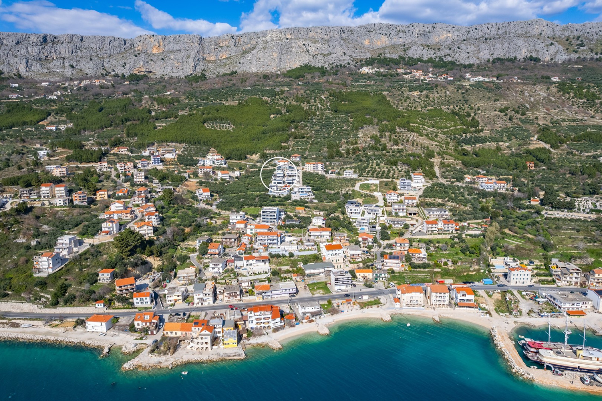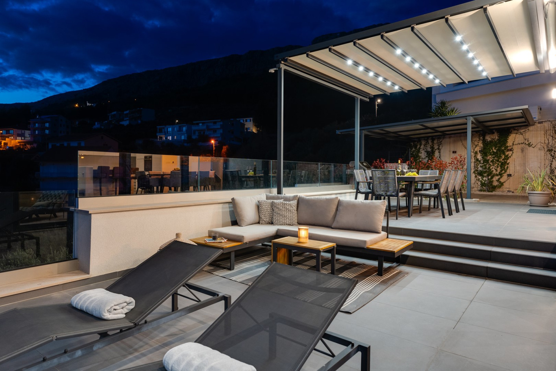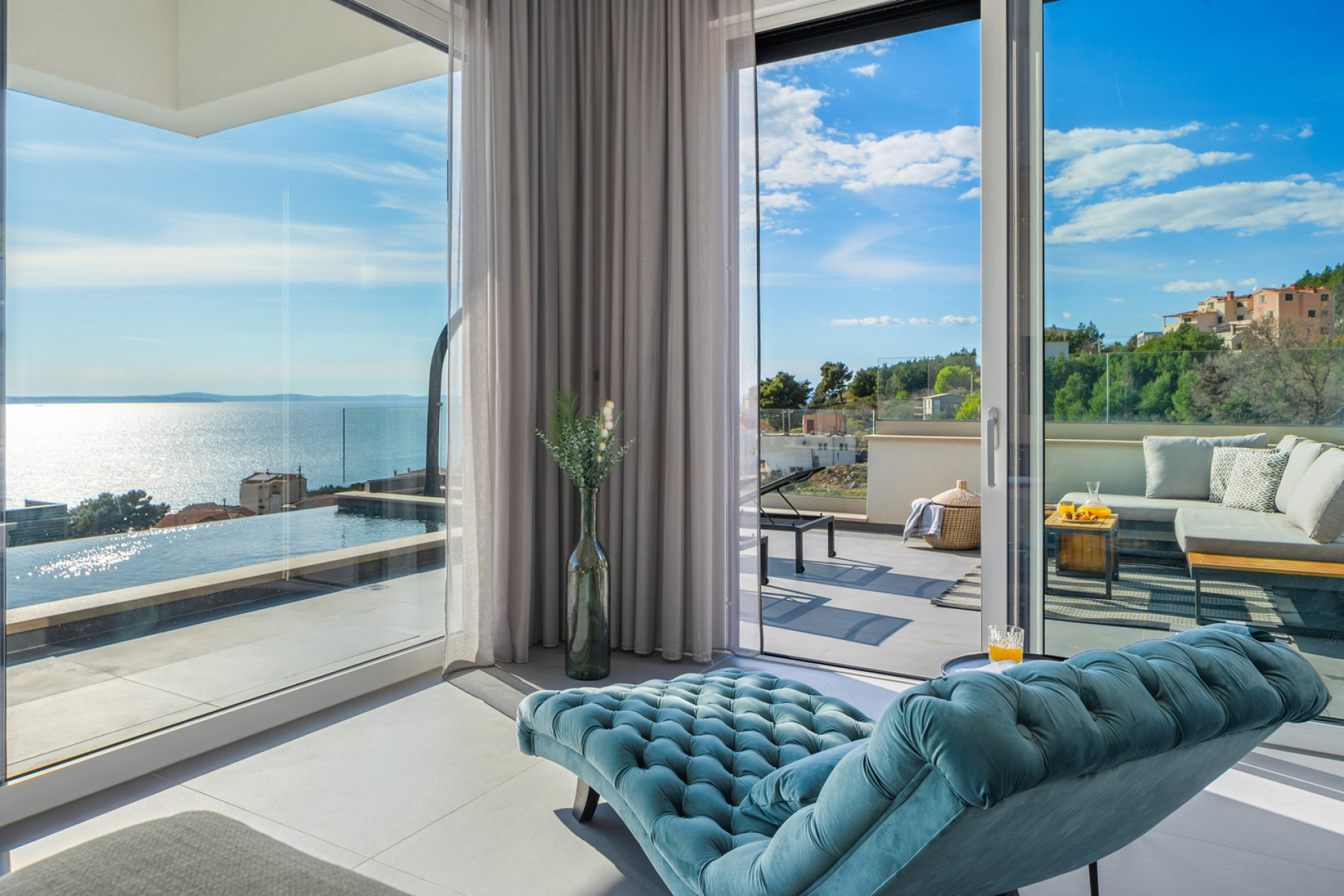 Villa Grey is beautifully designed with so many glass doors and windows offering nice sea views, a very bright and pleasant interior with sun in every corner, and furnished with style and elegance. The house is located above the coastal road, and a car is highly recommended to get anywhere (due to a bit of a steep location), but the location offers a beautiful view of the Adriatic Sea, the mountain behind, and the island of Brač. The nearest mini market, restaurant, and bar are within 2km.