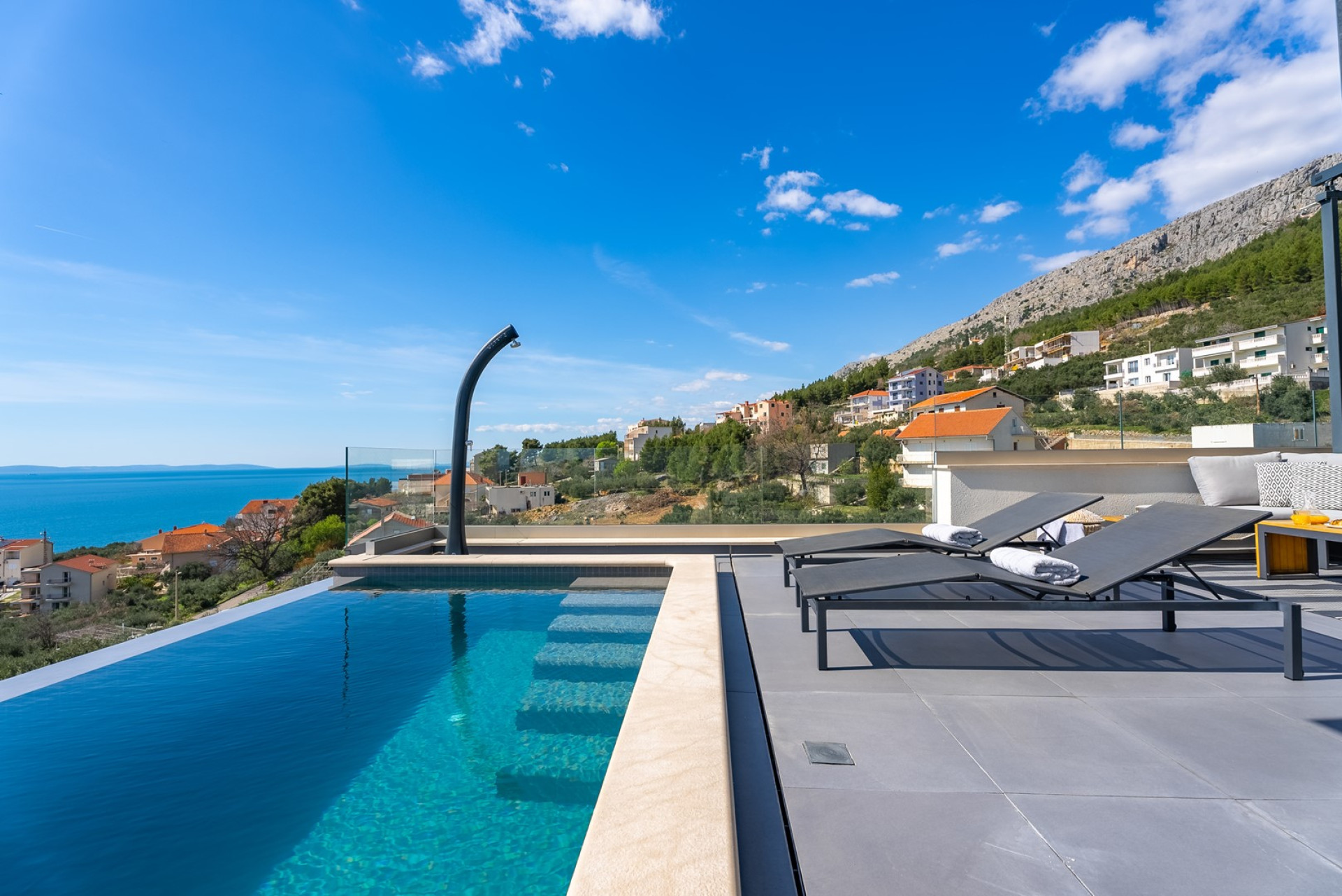 Villa Grey is a newly built and modern property with views of the sea and mountains. Fully air-conditioned 4-bedroom villa with free WiFi, Finnish sauna, and private heated pool, situated in a quiet location in the famous village of Krilo Jesenice (2km above the coast road), only 2 km from the beach. Duće and Omiš (9km) are some of the most famous Croatian tourist destinations in the Split area. It is a nicely organized property located on a private plot of 404 m2 and offering 213 m2 of living space spread over three levels - lower ground floor, ground floor, and first floor, and it can accommodate 8 people. The perfect home away from home for family gatherings or a group of friends looking for a relaxed or active vacation in Croatia. There is a secured parking place on a fenced private plot for 3 cars, and a car is recommended; there is an EV charger if you have an electric car. The video surveillance covers the main entrance and the outdoors of the whole property.