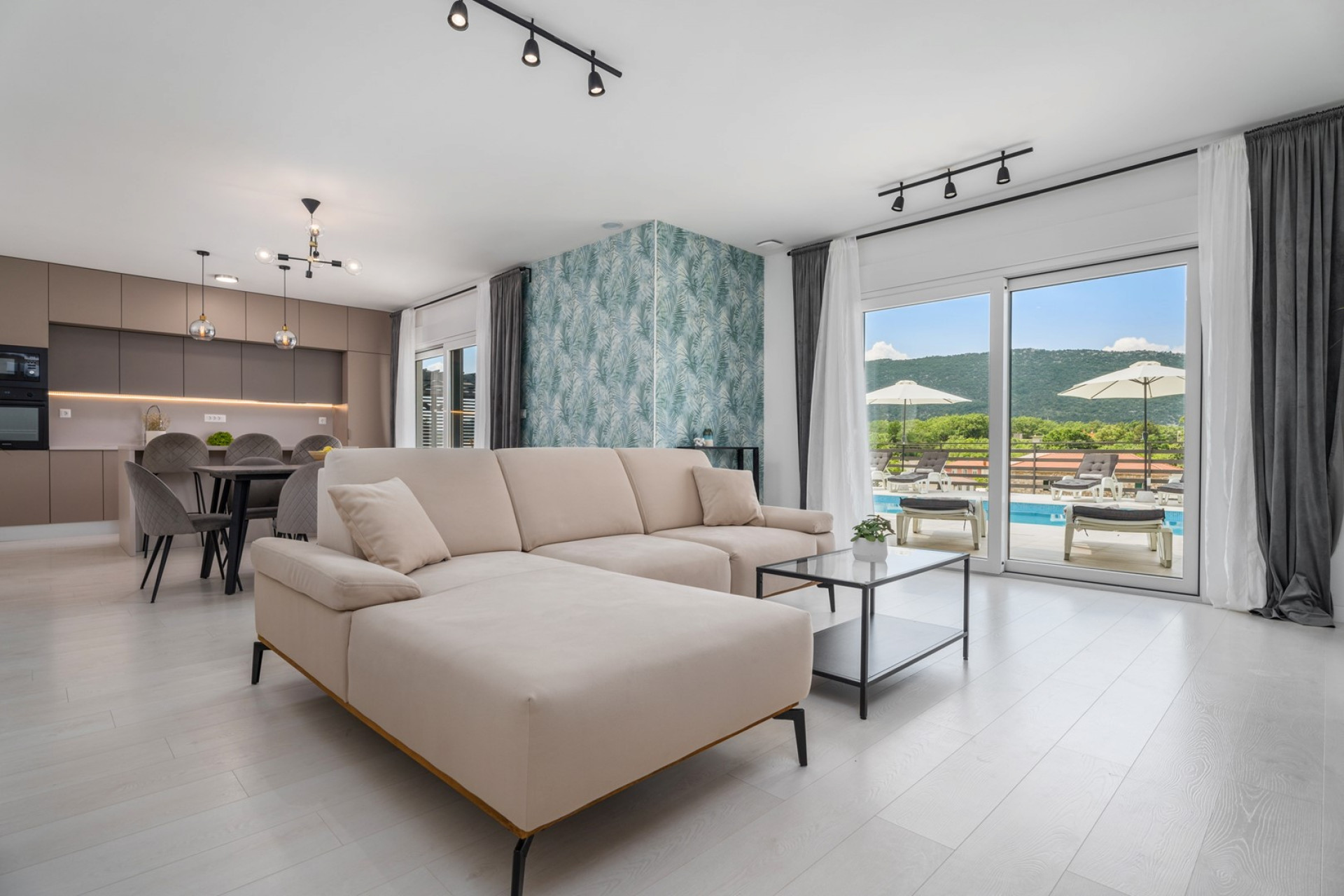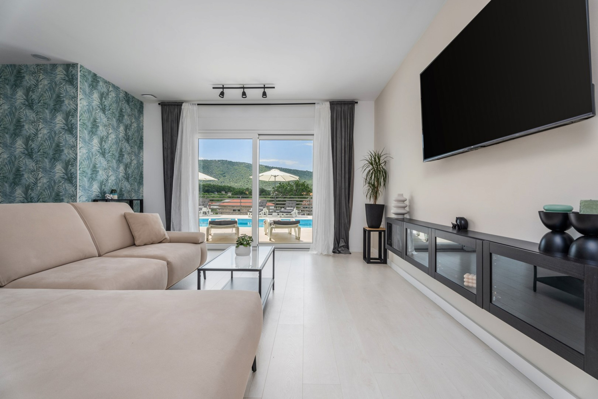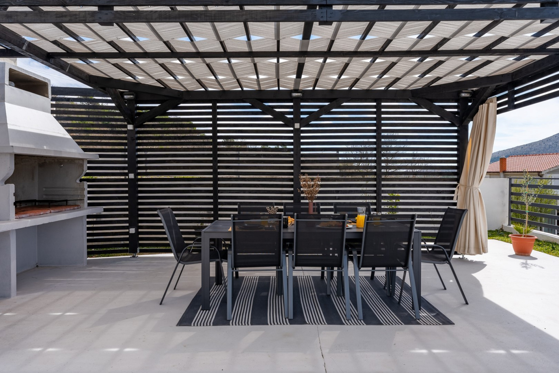 The newly built Villa Mirage offers a very comfortable and functional stay for a perfect family vacation. Located in the village of Tugare with a minimarket, bar, and pizza place only 50m from the property, and only 8km from the cute Mediterranean town Omiš with its famous sandy beach, and Cetina river with many activity options. The famous town Split is only 25min drive away (19km), and the nearest highway entrance is in Blato na Cetini (21km). Villa itself offers 234 sqm of very nicely organized interior positioned on a 960 sqm fenced plot. It offers 4 bedrooms with king-size beds, 4 bathrooms, a fully equipped kitchen and a living room, a laundry, a garage, a private pool with a sun deck area, and a covered outdoor dining area with a traditional barbecue for perfect evenings next to the pool, overlooking the village center and an outdoor playground for kids.