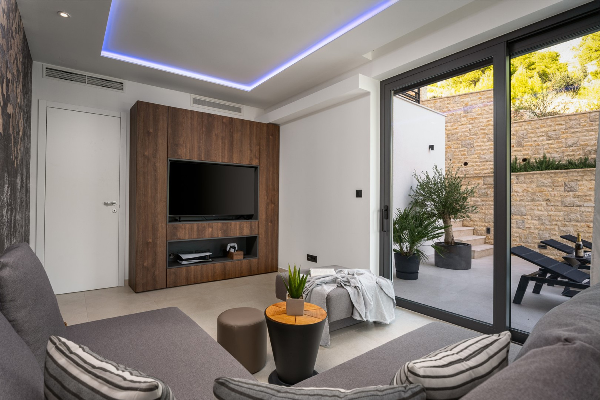 *At the ground floor (pool level) is fully air-conditioned and covered with free WiFi. There you will find a fully equipped kitchen with a dining table for 8 people, a TV, A/C, and a sliding door toward the pool area. There is a Media room with a flat-screen TV, PS5, Bose sound bar, air conditioner, a sofa (that can convert into a sofa bed), and a sliding door toward the pool area. There is also a Finnish sauna, a walk-in shower, and a separate Toilet.