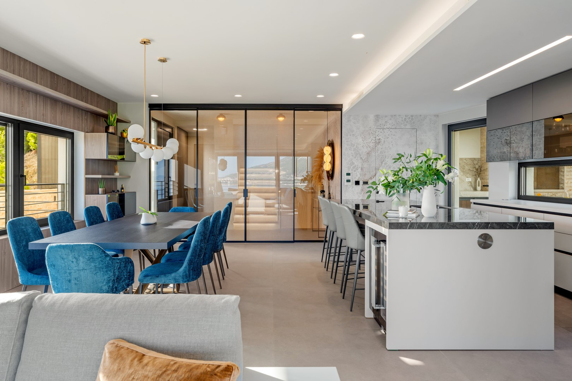 * The first floor offers a very stylish and very comfortable living area with a flat-screen TV, A/C, an Electric Steam Fireplace, a few sofa areas, and spectacular sea views and mountain views wherever you look thanks to the glass-to-ceiling windows. A fully equipped kitchen with a dining table for 8 people, and a kitchen island with bar stools, the kitchen is equipped with all the amenities you need for a comfortable stay (microwave oven, capsule coffee maker Nespresso, a toaster, a kettle...)., direct exit to outdoor dining area with the barbecue overlooking the mountains and the sea. A separate toilet.