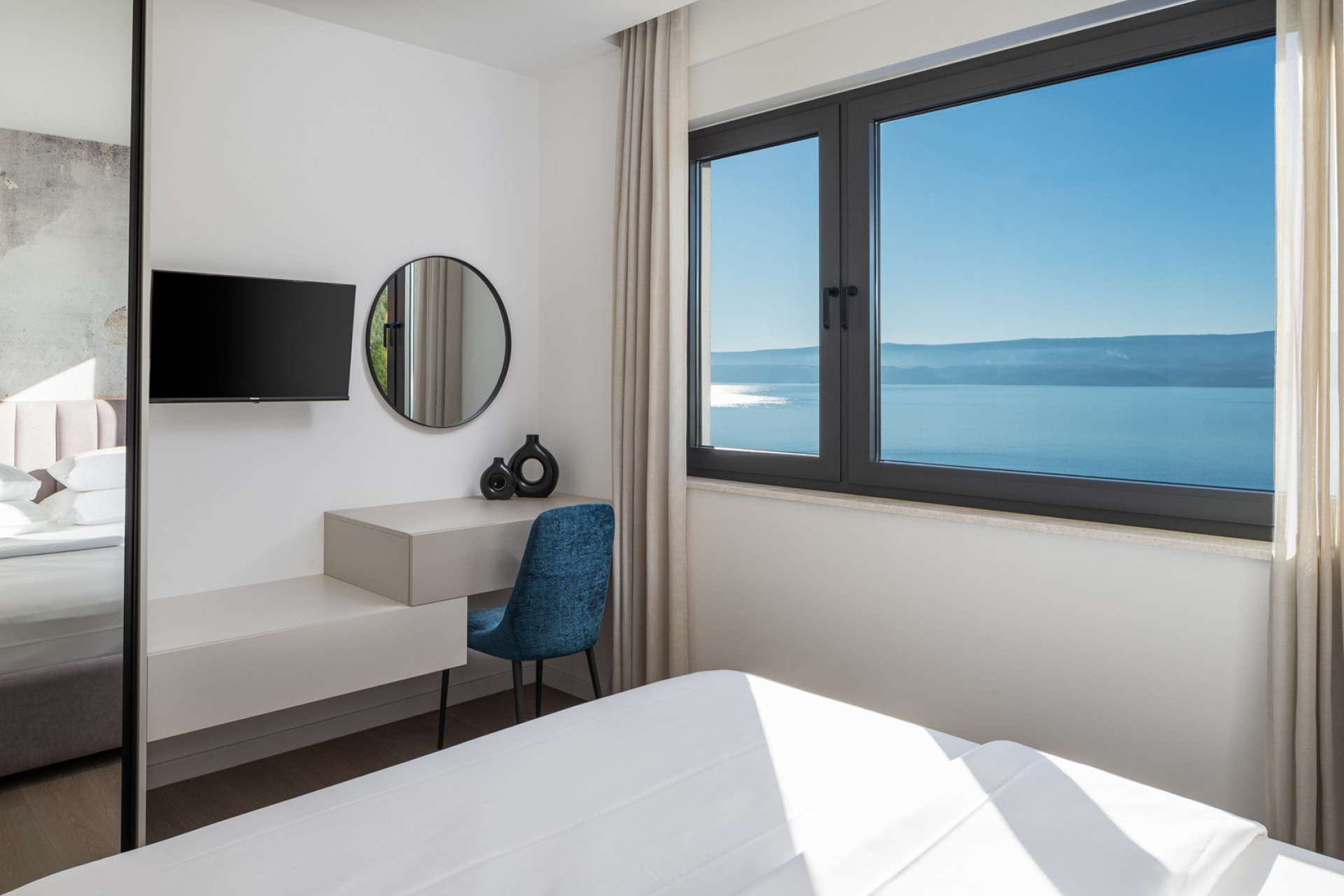 Bedroom No1 (21,4sqm) with a king-size bed 180cm x 200cm, TV, A/C, en-suite bathroom with a bathtub (5.8sqm), panoramic sea views and a direct approach to the terrace with a lounge corner just for you.