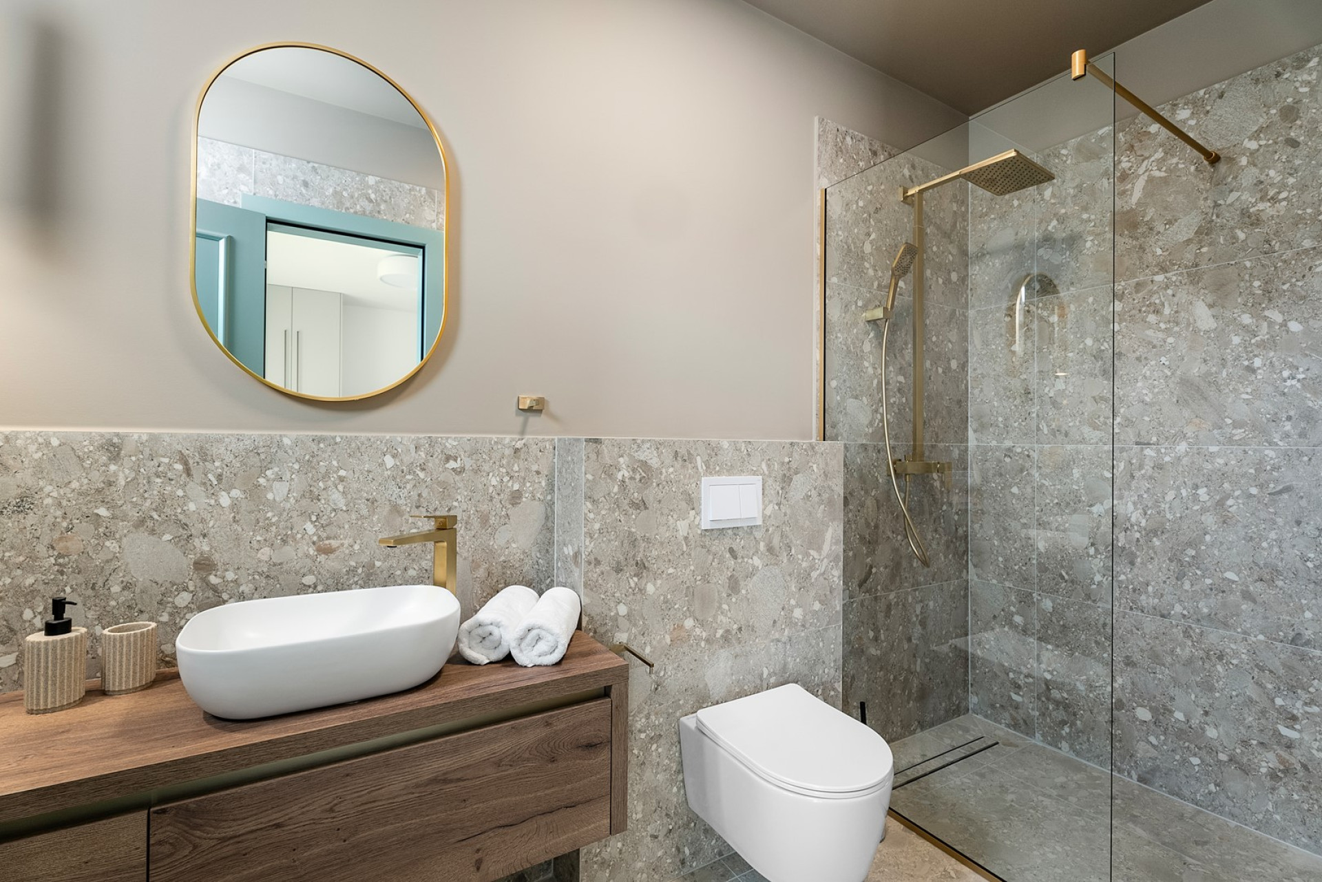 Completing the villa's amenities is a well-appointed family bathroom with a convenient shower, a washing machine, and a dryer, ensuring that every aspect of your stay is thoughtfully catered for.