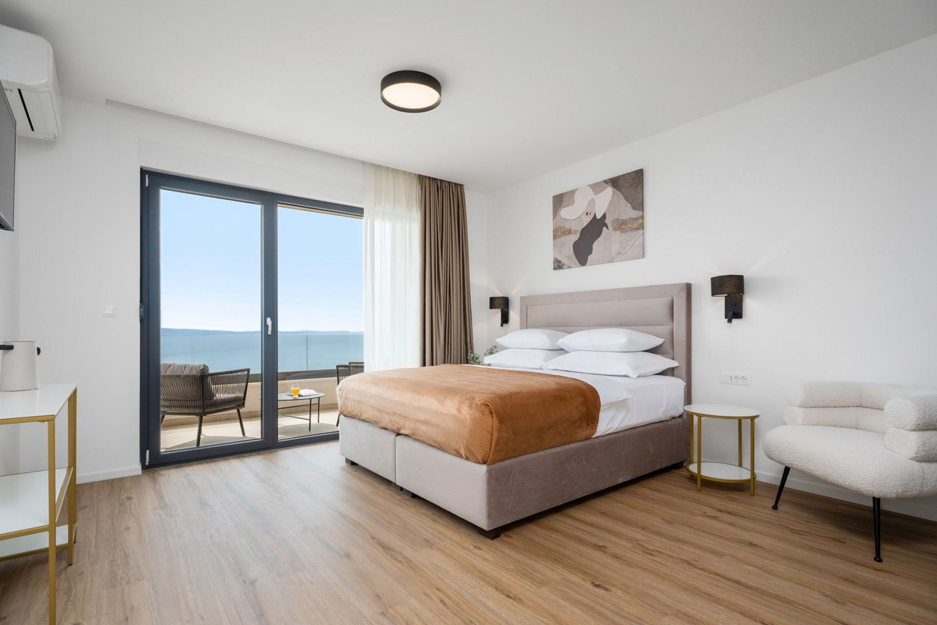 a Bedroom NO1 (20sqm) with a king size bed 180cm x 200cm, a sofa, A/C, a TV, an 8sqm balcony with a table and two chairs, a perfect spot for enjoying the romantic sunsets with a glass of wine.