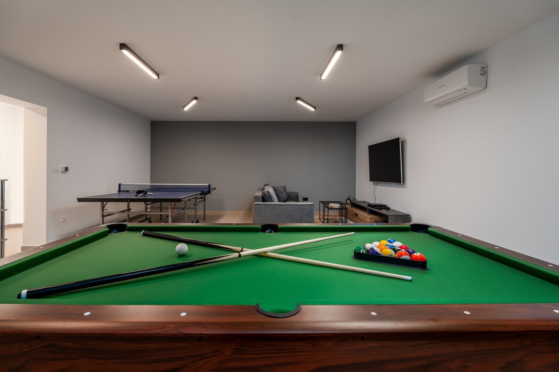 * The LOWER ground floor - parking/garage level offers an airconditioned and spacious, 50sqm play zone with a sofa, PlayStation 4, JBL speaker, a Billiard (Pool table), Table tennis, and a fridge for refreshments. Next to it is a cute spa zone with an infrared sauna with 2 deck chairs, a shower, and a separate toilet.