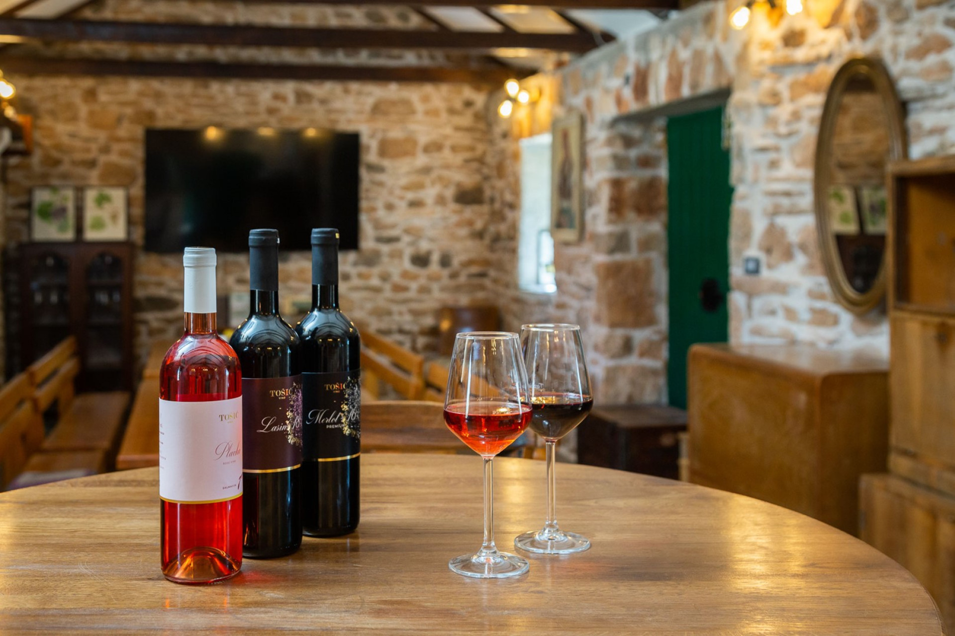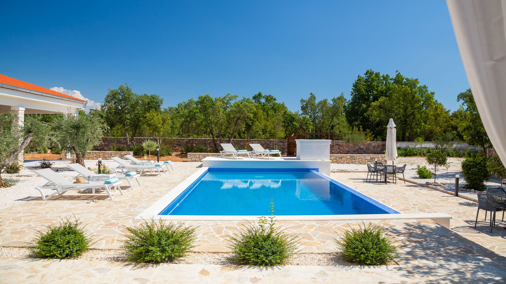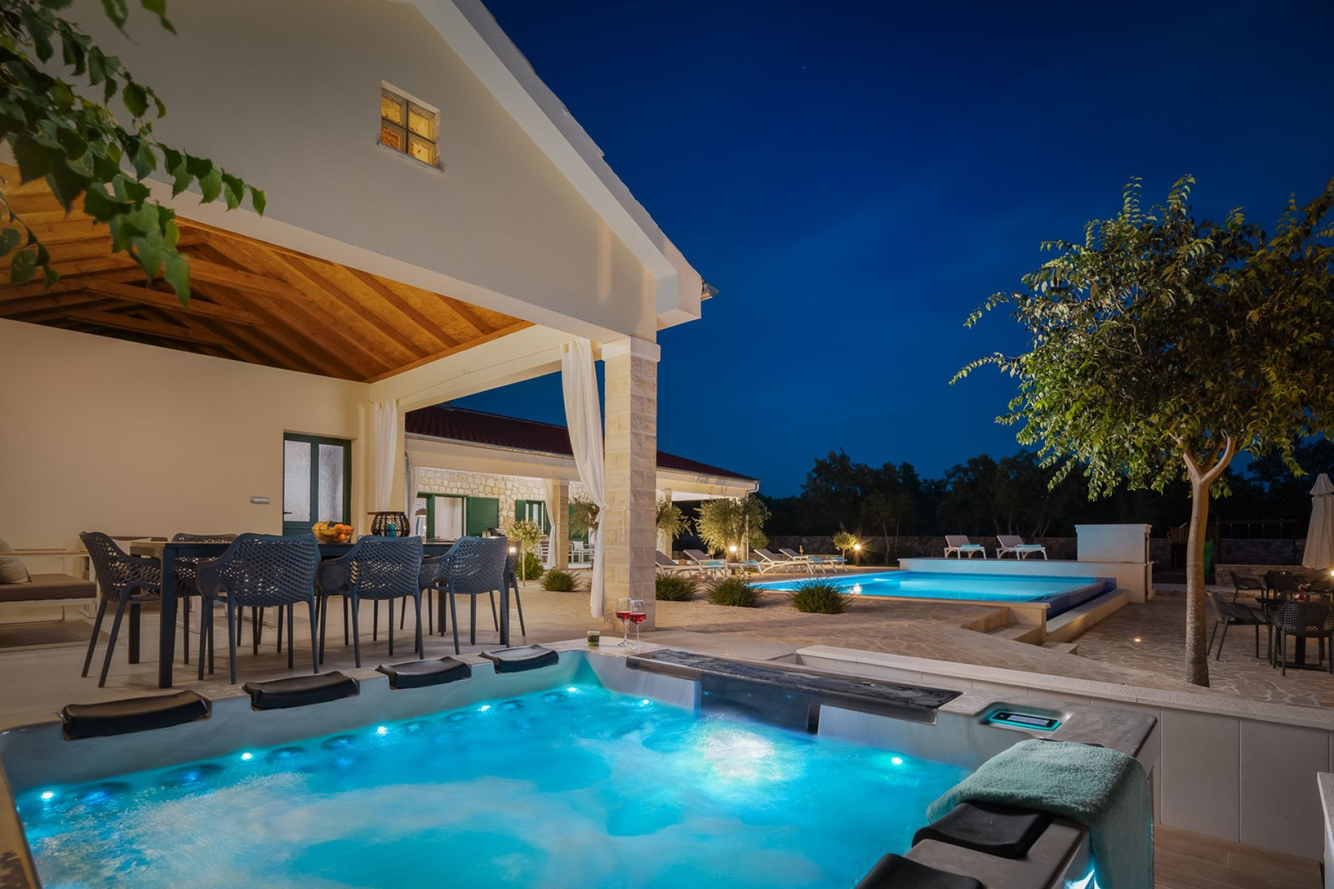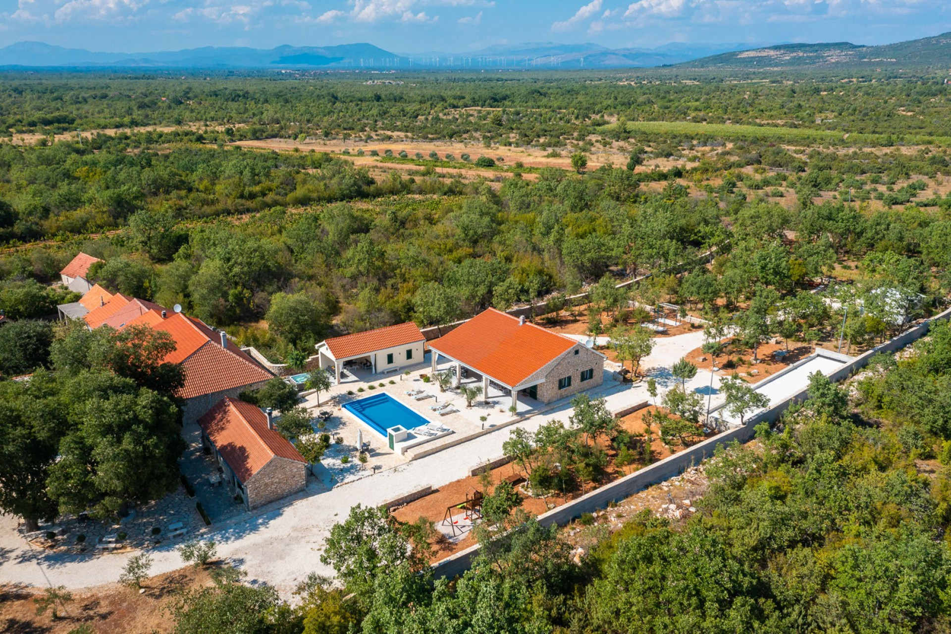 Experience the unspoiled and peaceful environment of the vineyards and traditional stone houses by staying in Villa Tošić Estate in Razvode village, close to Drniš. Stylish accommodation settled on a 10,000 sqm fenced private plot, among the vineyards, olive trees, Villa Tosic Estate offers an absolute privacy and a perfect blend of modern and traditional. Winery and vineyards are also part of the estate (all together 50.000 sqm), and you have the possibility to taste and buy very tasteful wine from the owner. Tosic Estate offers exclusively for you 2 separate villas and comfortably accommodating 12 people (6 bedrooms, 5 bathrooms), a spacious Wine tasting room, a Finnish Sauna room, an Outdoor Hot-Tub, a Heated 50sqm private Swimming pool, a Billiards, a Table tennis, a Playground, a Bocce court, Outdoor exercise equipment, 4 Mountain bikes, an organic Garden and a private Park.