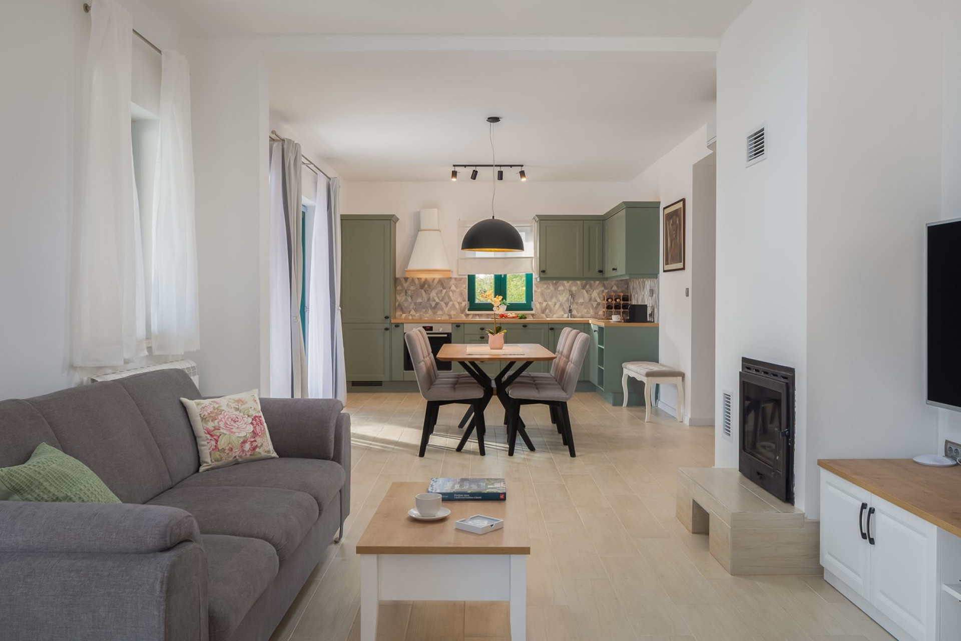 * VILLA No1 offers a spacious, glazed terrace with Billiards, Darts, a wooden dining table and two handmade wooden bar tables. From this terrace you enter the beautifully decorated and fully equipped kitchen (espresso coffee machine, refrigerator, microwave oven, kettle, toaster...) with a dining table for 8, a living room with a fireplace, a sofa, a flat screen TV, air-conditioning, free WiFi, a Netflix