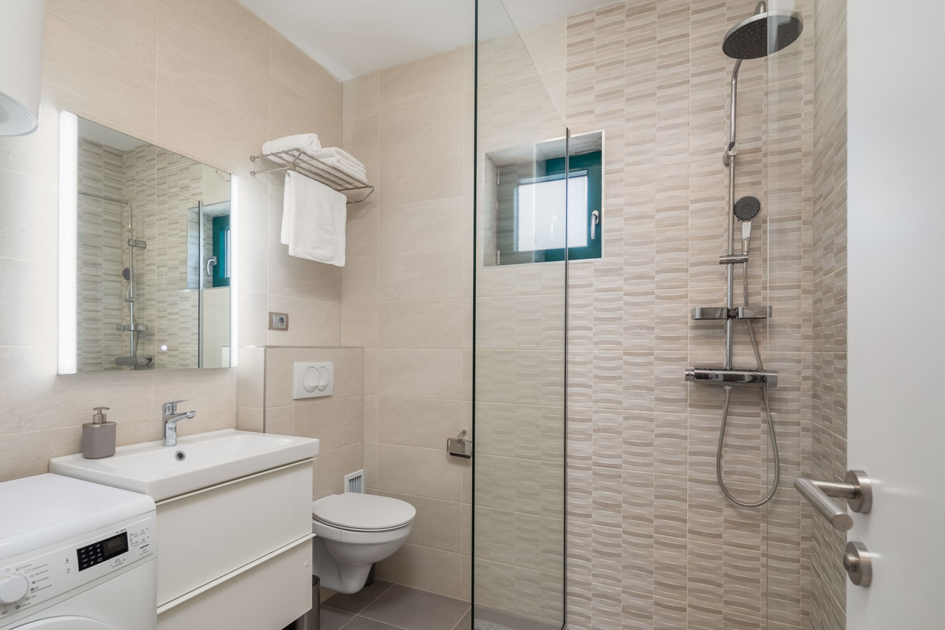 * The OUTDOORS offers a private, infinity, heated swimming pool 10m x 5m with hydromassage, a spacious sun deck area with 6 deck chairs, an outdoor shower, few lounge corners and an outdoor Hot-Tub (Whirlpool). Next to it is a Sauna room with a Finnish sauna, a family Bathroom NO1 with a walk-in shower, two sinks and two separate toilets. There is a covered terrace with a dining table and a lounge corner in front of the sauna room.