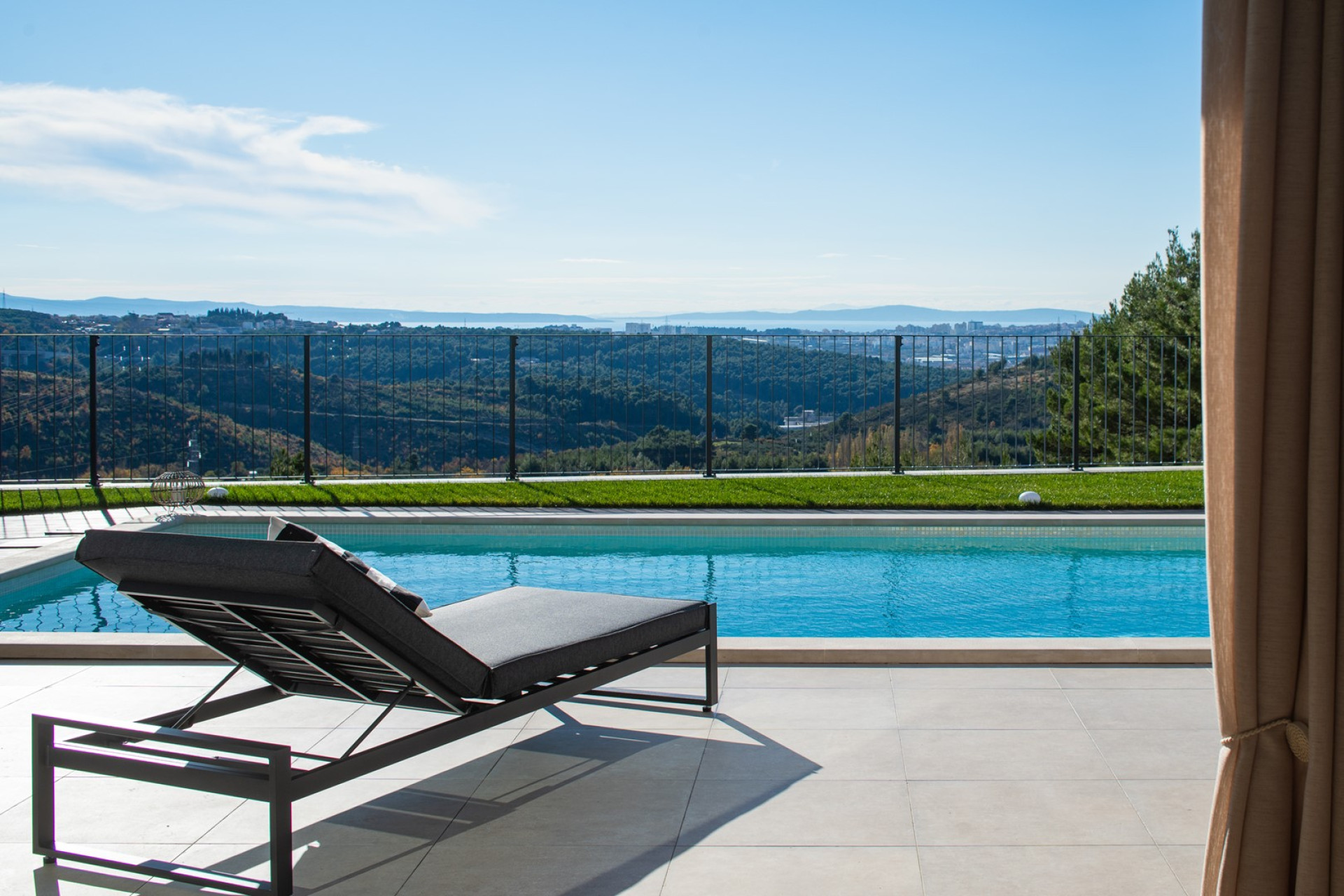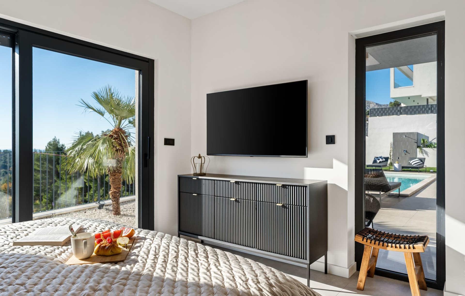 - Bedroom 2 (11,25 sqm): Another inviting king-size bed (180 cm x 200 cm), a TV, air-conditioning and direct access to the outdoors with relaxing chairs overlooking the pool and the town of Split.