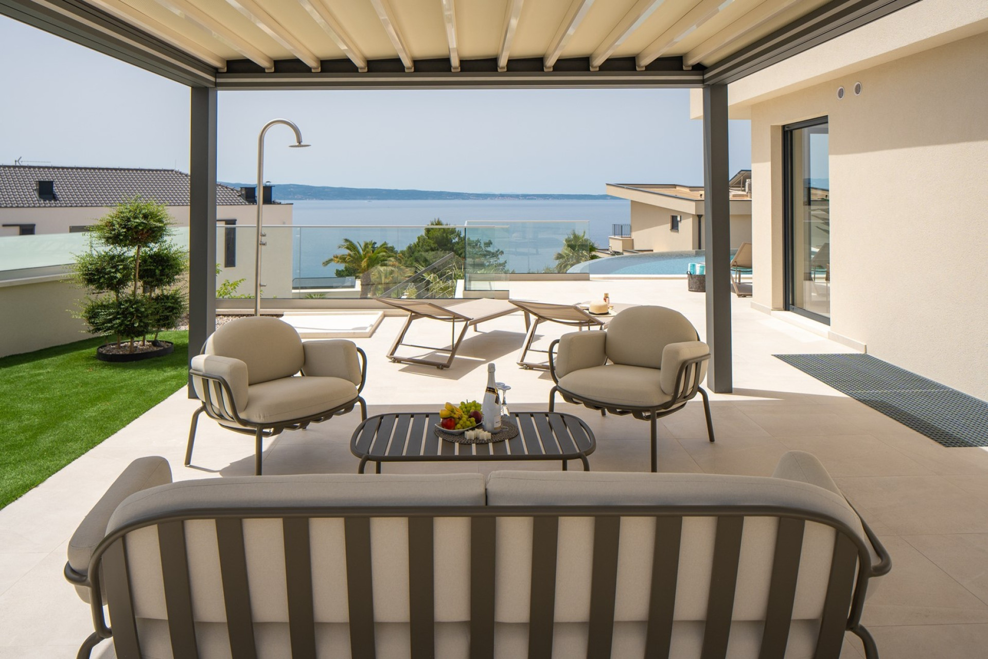 *The outdoor space, which is on the elevated ground floor, has a private, heated 40,5 square meter (9 x 4,5 meter) infinity pool with hydromassage and a fully automated salt electrolysis system. It also has six deck chairs, an outdoor shower, a covered dining area that can seat eight people comfortably, and a kitchenette with a gas barbecue, a lounge area, and open views of the sea that also overlooks the villas. You can access the sun deck area and a traditional barbecue corner for your grilling prowess behind the chic and cozy lounge corner.