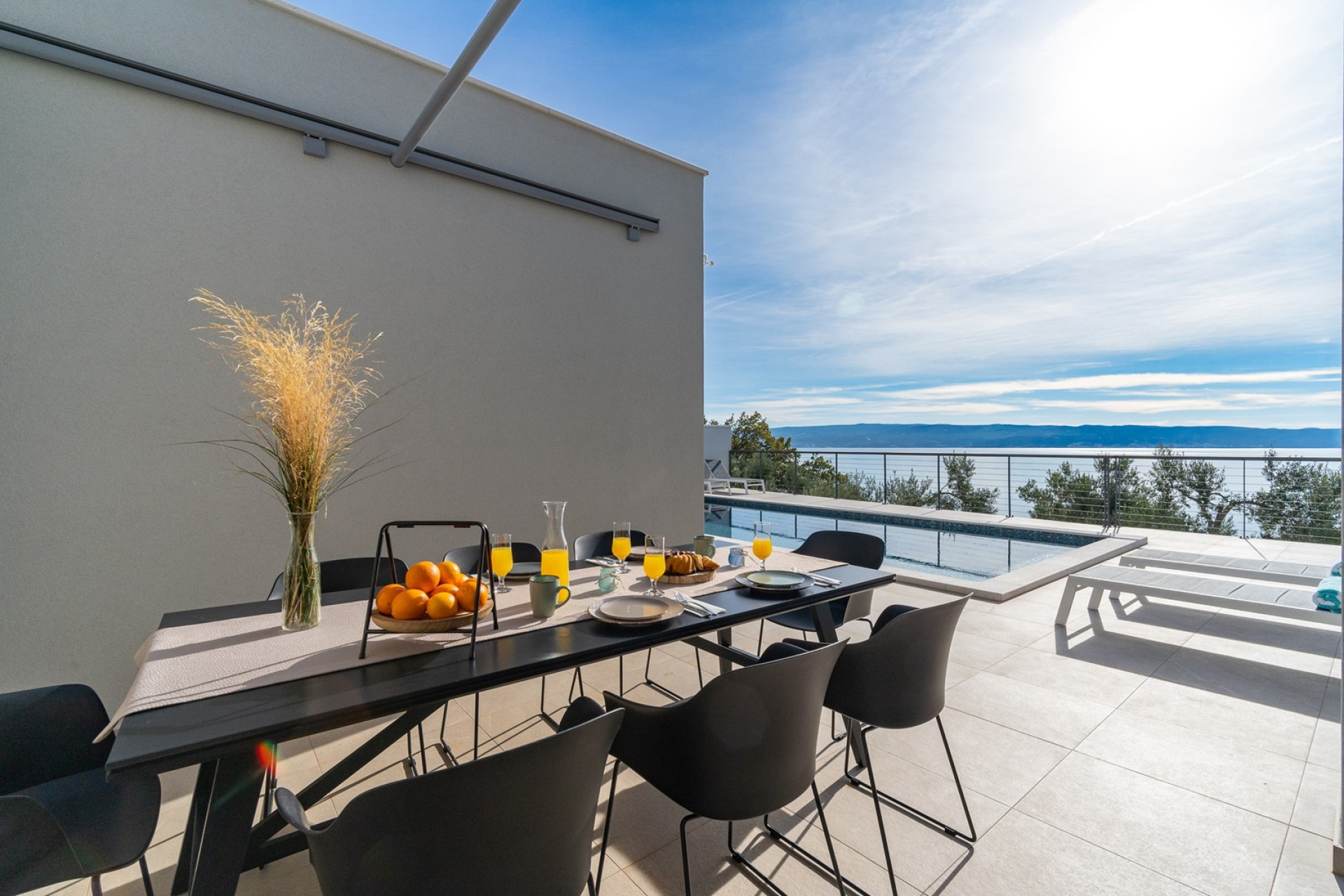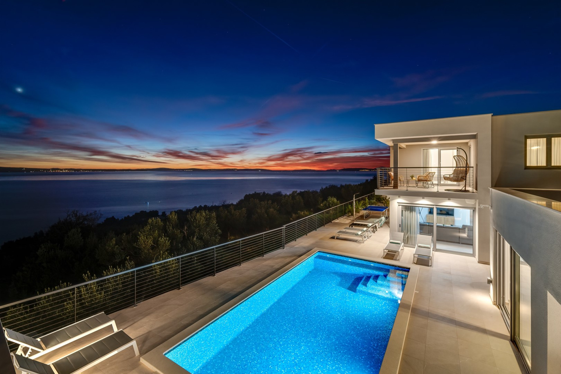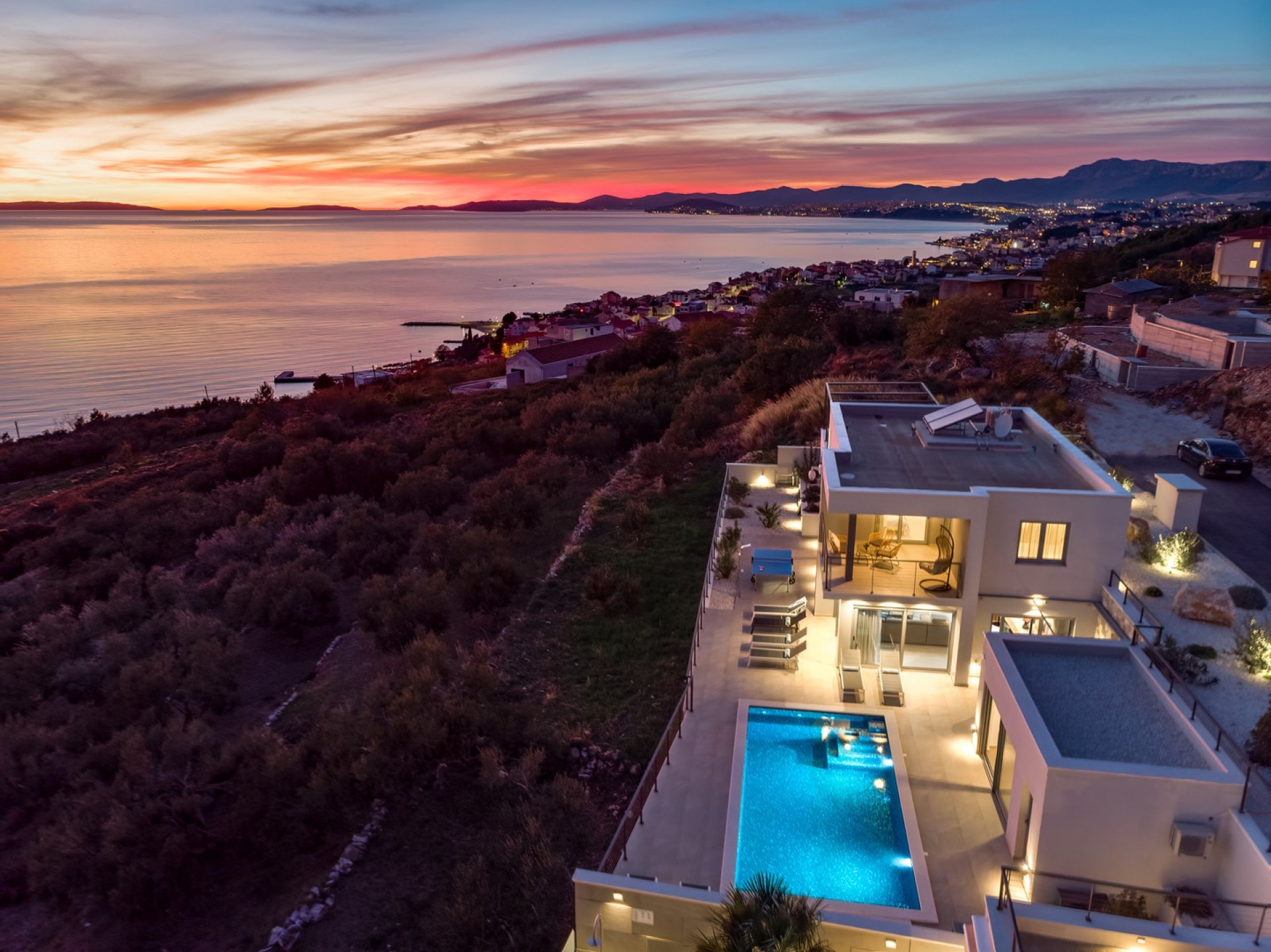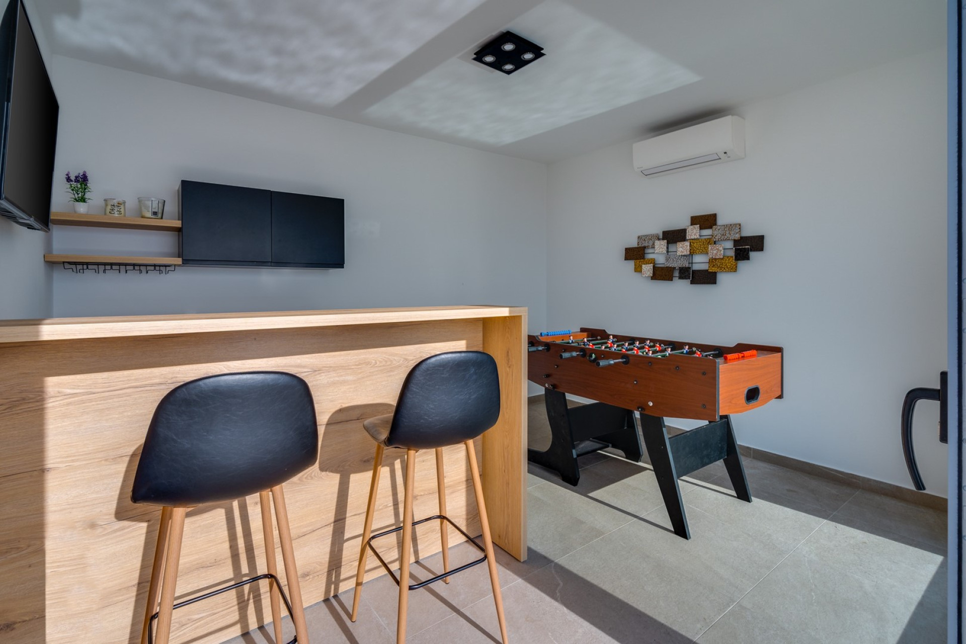 * Outdoors (pool level) offers a private and heated pool 8m x 4m with a fully automated salt electrolysis system (Chlorine-Free system). You have amazing views of the Adriatic sea, a sun deck area with 8 deck chairs, outdoor table tennis, an outdoor shower, a lounge corner for relaxing in the sunset views, a covered outdoor dining area with a barbecue (direct approach to the kitchen and living room), and a pool bar with A/C, a TV, and table soccer.
