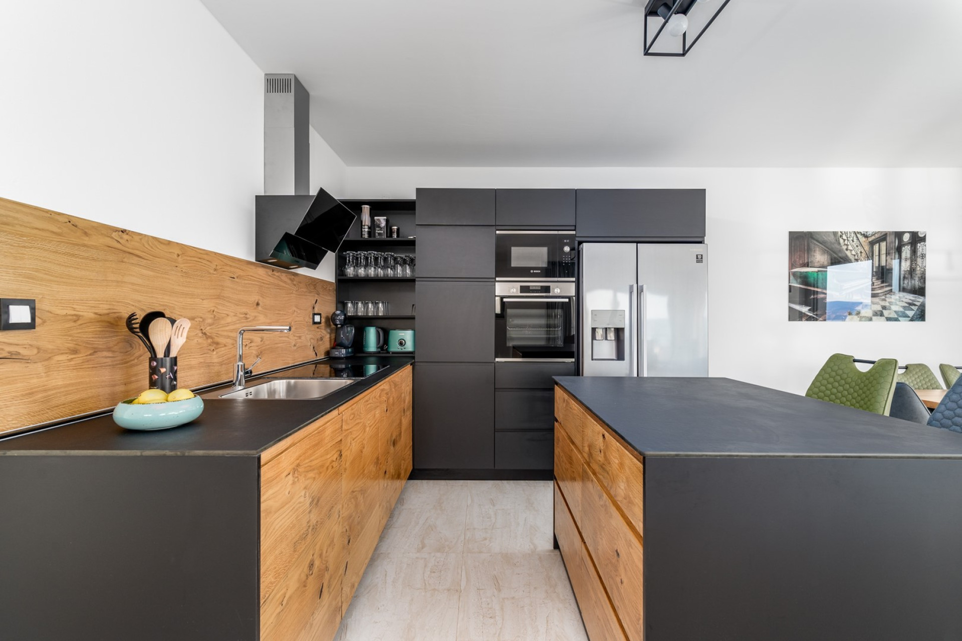 * The ground floor (pool level) offers a fully equipped kitchen with a dining table, a glass door toward the pool, and an outdoor dining area. A living room with a flat-screen TV, A/C, and a comfortable sofa. A Bedroom No. 1 with a double bed 160cm x 200cm, en-suite bathroom with shower, a flat-screen TV, and an exit toward the outdoor sundeck and pool area. There is a separate toilet, as well as a washing machine with ironing amenities.