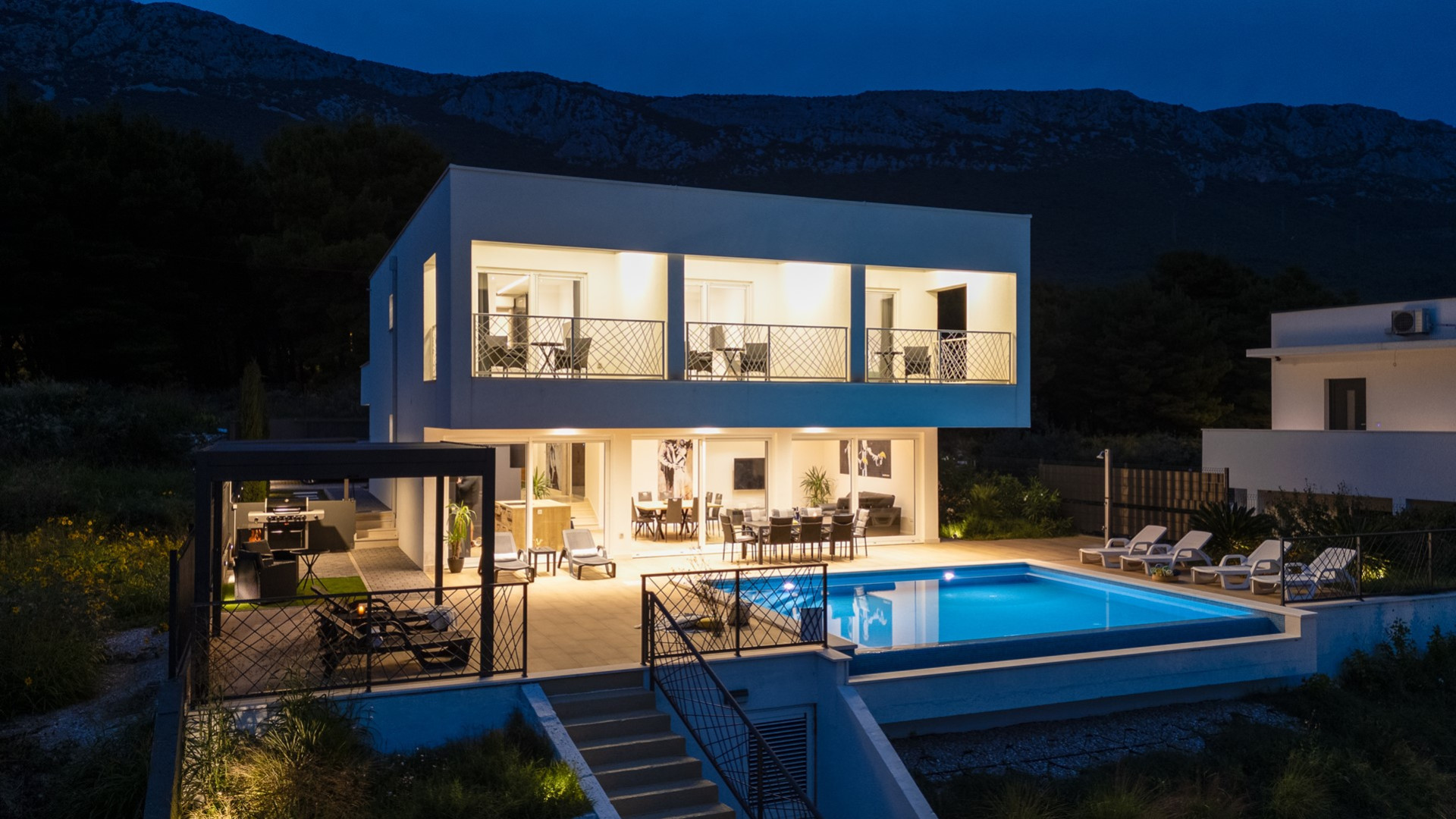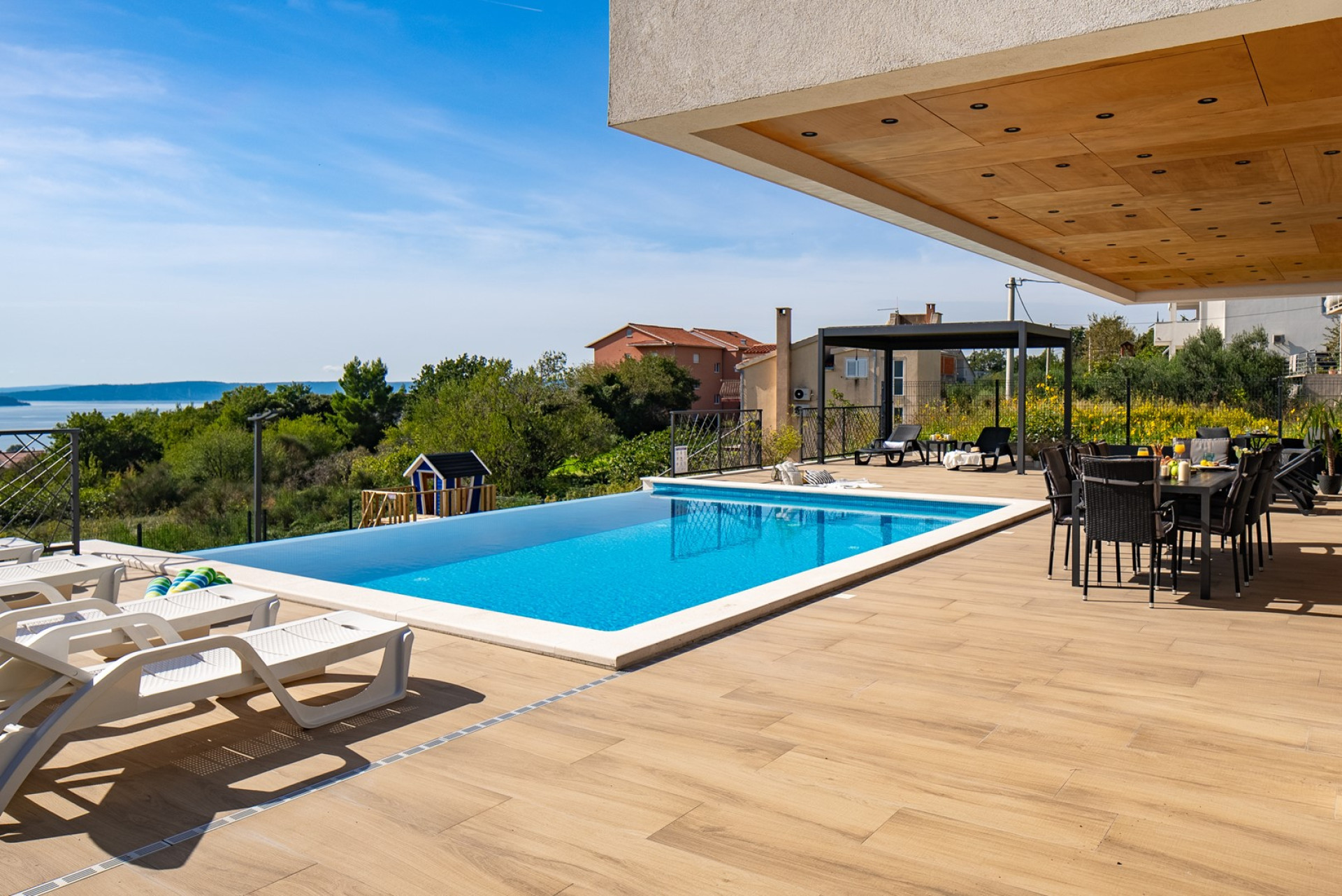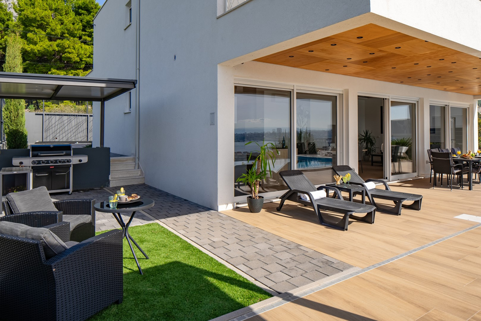 * The outdoor area offers exclusively for you a heated private 6m x 6m swimming pool with hydro-massage, 8 sun deck chairs, a covered outdoor dining area with amazing views of the surroundings and the sea, a lounge corner, a gas barbecue, an outdoor shower, a slide and a swing for your youngest. The evenings here are spectacular, enjoying a glass of wine overviewing the sunset and the town's Split lights.