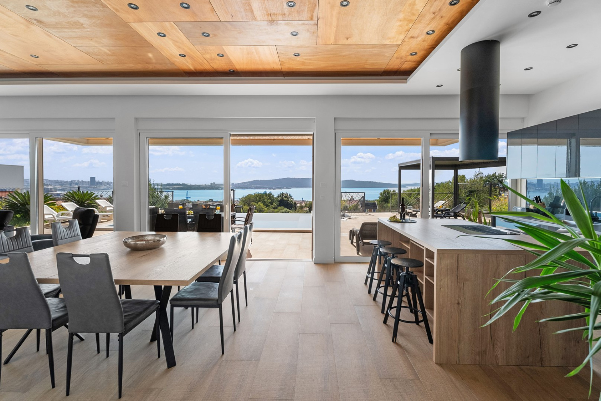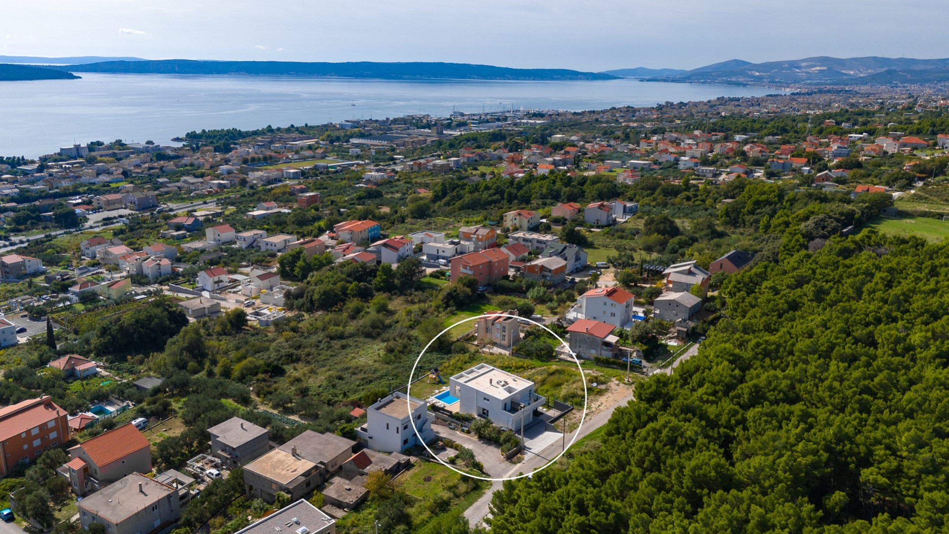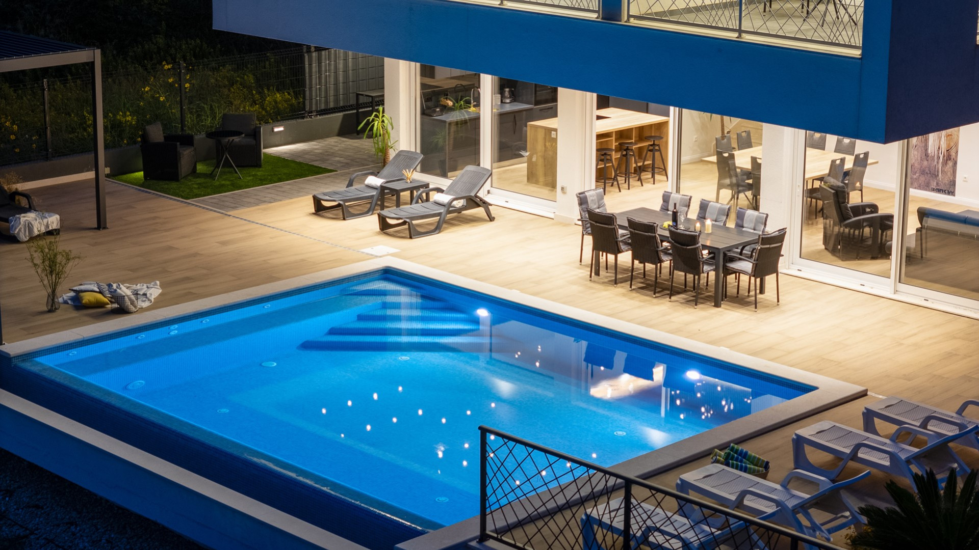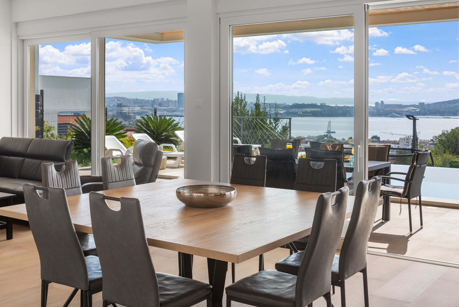 * The outdoor area offers exclusively for you a heated private 6m x 6m swimming pool with hydro-massage, 8 sun deck chairs, a covered outdoor dining area with amazing views of the surroundings and the sea, a lounge corner, a gas barbecue, an outdoor shower, a slide and a swing for your youngest. The evenings here are spectacular, enjoying a glass of wine overviewing the sunset and the town's Split lights.