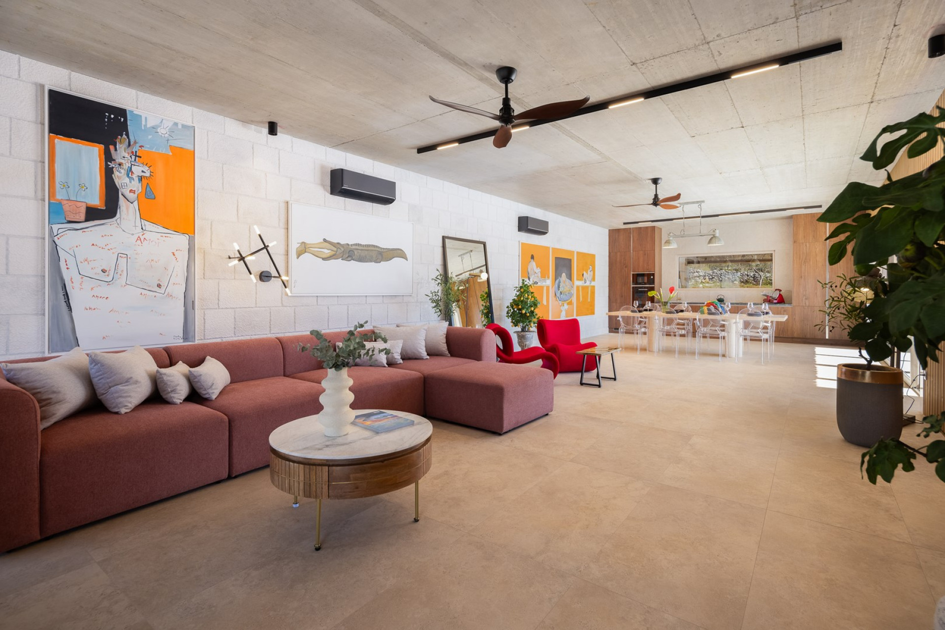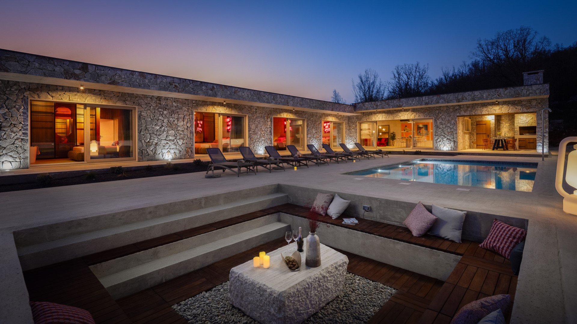 Set on a generous 3,400 sqm private plot, Villa Fantazija features 240 sqm of beautifully styled interiors across a single level. The open-plan living and dining area (80 sqm) boasts comfortable sofas, a flat-screen smart TV, and a fully equipped kitchen, perfect for preparing delicious meals. The dining space accommodates up to 8 guests and opens up with sliding glass doors to the stunning outdoor areas, seamlessly connecting indoor comfort with nature's beauty.